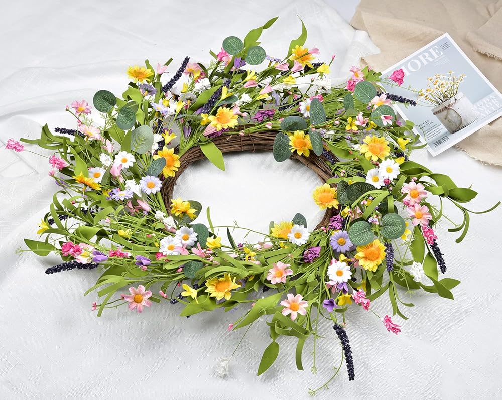 Our floral wreath is surrounded by colorful daisy flower,lavender flower in colors,look very lifelike,wreath is handmade featured with silk flower,and natural vine base,this flower wreath stays green, fresh, and neat all year long with no water required, adding a fresh spring romantic atmosphere to the room in the whole year