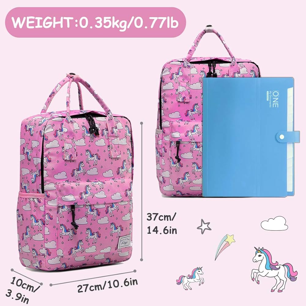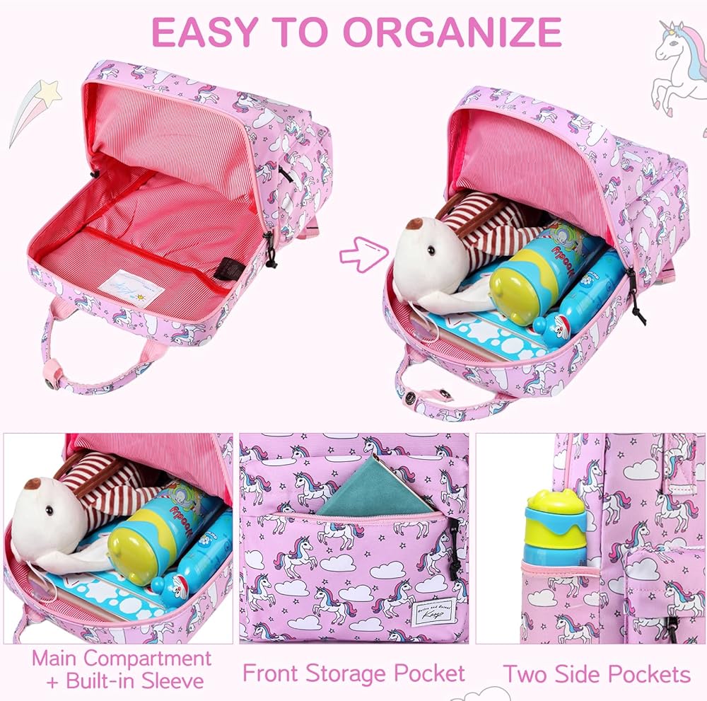 ★WELL ORGANIZATION: This cute and unique children backpack has plenty of space for storing essentials. The large main compartment can hold books, A4 folders, toys, clothes and other school supplies. The small padded compartment is for iPad or tablet computer. Your little one could keep their pencils or morning snack in the front pockets. Two sides pockets for water bottle or umbrella. Based on its functions, your kids will be good at taking charge of their own belongings.