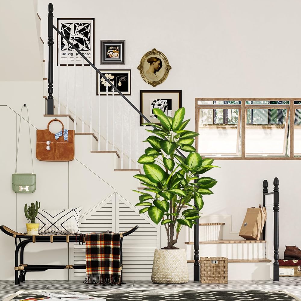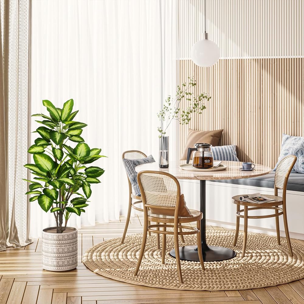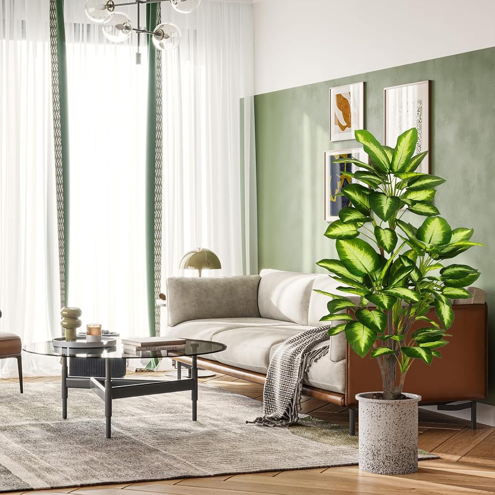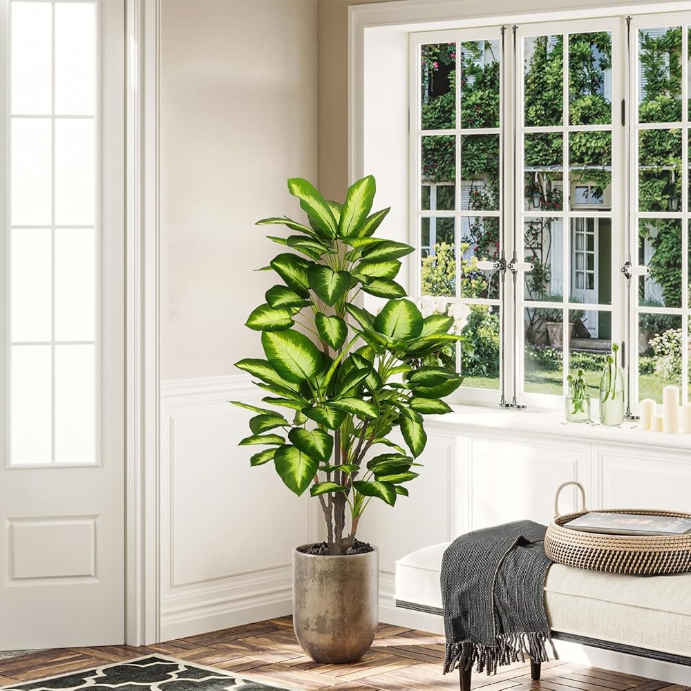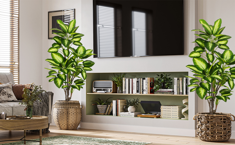 【Perfect Size for Decor】For those who enjoy touching in addition to visual admiration, this 4ft tall artificial golden Dieffenbachia tree is a treasure to behold. Height measures from the pot bottom to the furthest extended leaf BEFORE the arrangement. The non-decorative pot is made of PP, with cement poured inside which ensures the overall stability. You can set it into a decorative planter of your choice to glamorize its look and match your home decor.