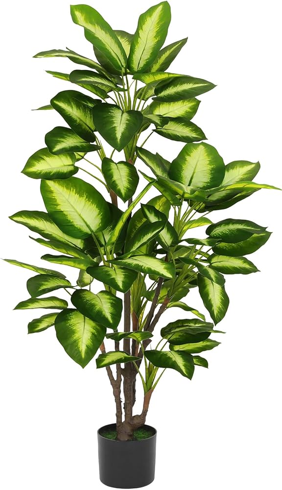 【Indoor&Outdoor Use】This 4ft tall faux golden Dieffenbachia tree plant in pot can express a sense of beauty and style indoor or outdoor. Please put it under shelter or covered space if it's for outdoor use. Supported with thick, accurately designed trunks, the dense plumage of feather-like leaves spill out at various layers to create an interesting multi level design, this fake plant can be a long-lasting gift for friends and families for important days.