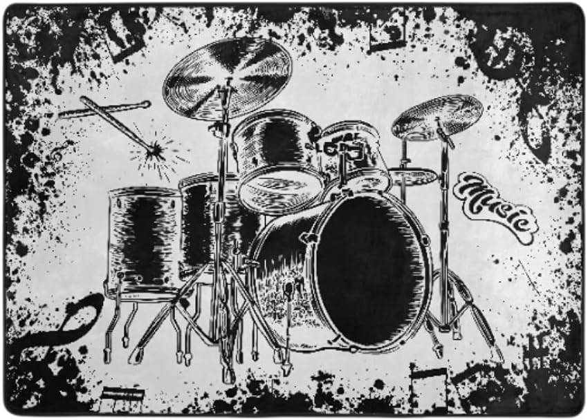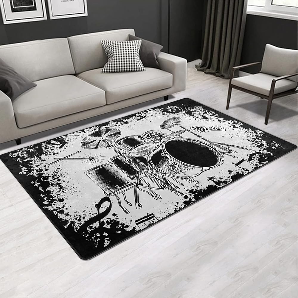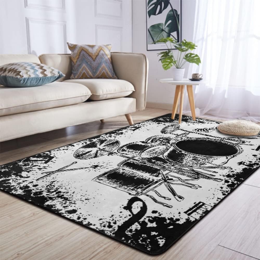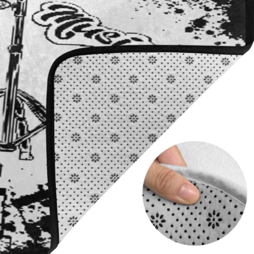 Music Area Rug Drum Set Vintage Black Music Rugs Throw Rugs Non-Slip Floor Mat Soft Carpet Doormats for Living Room Bedroom Apartment Dorm Home Decor 5'x7',White/Black