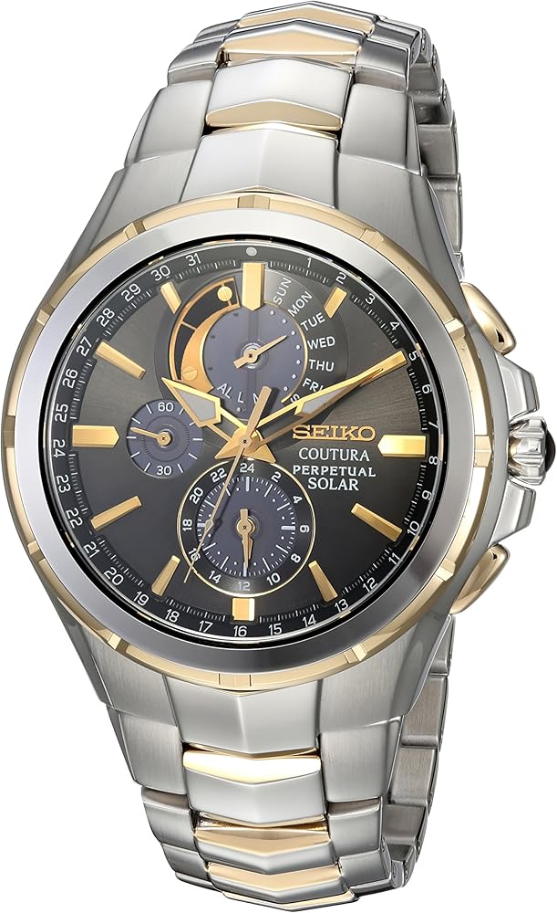From the Coutura Collection. Delivering the perfect blend of sport and style for those on the move, Coutura is crafted for effortless timekeeping excellence. The newest designs offer fresh color variations with pops of contrast and an emphasis on modern luxury. Included is this sophisticated solar alarm chronograph anchored by a silver sunray dial with blue accents and subdials, a power reserve indicator, leap year, month, day and date display, and LumiBrite hands and markers. The perpetual calendar adjusts for odd and even months, including leap years, until 2100. Crafted of stainless steel, this versatile watch includes a screwdown caseback, bezel with blue ion finish, sapphire crystal and cabochon crown. The chronograph function offers timing to 60 minutes in 1/5-second increments with split time measurement. Powered by any light source, with no battery change required, the energy-efficient solar cell provides a 6-month power reserve when fully charged. 10 bar, 100M Water Resistant