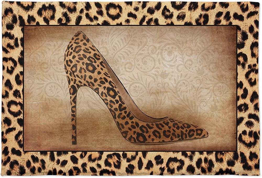 Floor Door Mats Shag Carpet Leopard Print Sexy Female High Heels,Non Slip Super Soft Bath Rugs Vintage Brown Animal Skin Texture,Shaggy Fuzzy Area Rug for Kitchen/Bathroom/Bedroom/Living Room Decor