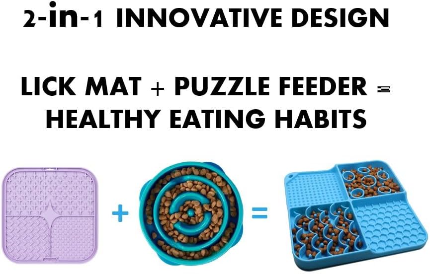 NEW 2-in-1 DESIGN: Our mat combines the benefits of a slow feeder and a lick mat. The mat has four quadrants with different textures. Use lower edge areas for liquid food like peanut butter, pumpkin or yogurt and higher edge areas for raw and dry food – no more mess on your kitchen!