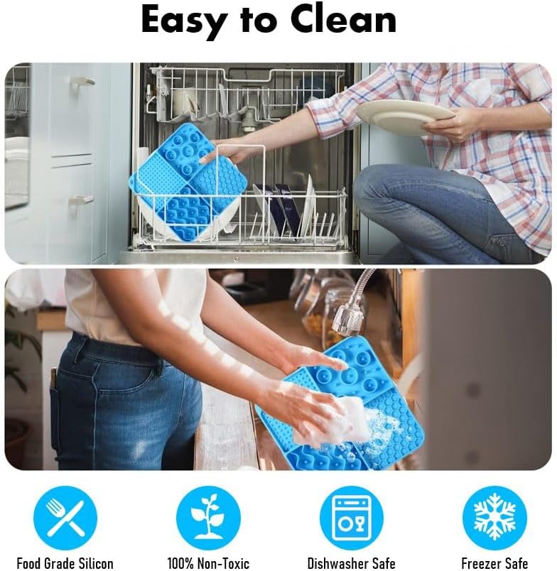 EASY TO USE AND CLEAN: Just spread your pet's favorite treat on the lick mat and place it on any smooth surface or leave on the floor. Our slow feeder has 80 suction cups on the back, so it won't wiggle around while your pet is eating. It's super easy to clean too! Just rinse it after use or put it in the dishwasher to sanitize.