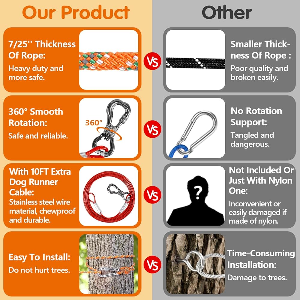 Keep Your Dog Safe: After buyer feedback, we upgraded the dog camping gear. Added premium thick felt to protect your tree and prevent the rope from slipping off the tree when the dog is excited. Compared to common dog camping accessories on the market, our pet overhead cable has added glow-in-the-dark and reflective material that will improve your dog's visibility at night. The wide movable range minimizes the chance of your dog getting strangled or tangled in a tree or picnic table.