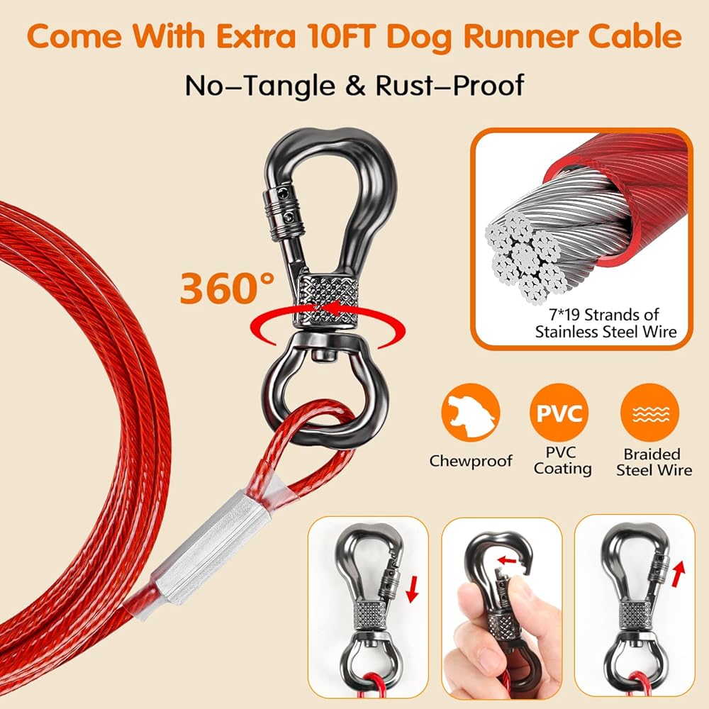 Heavy Duty Dog Runner: Dog Trolley System Length: 100ft, Diameter: 8 mm; Dog Tie Out Cable Length: 10ft, Diameter: 4.0 mm; Suitable for small, medium and large dogs. The dog runner for yard is made of reinforced rescue rope and heavy-duty steel buckles that can withstand a pulling force of 1600 lbs. 360° rotating clip-lock buckles allow your dog to move happily and safely without tangles for a more comfortable exercise space.