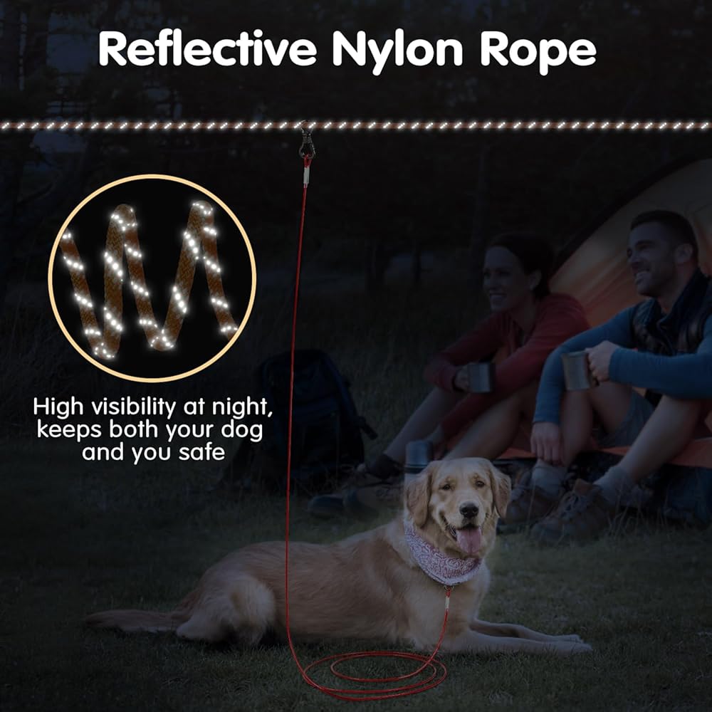 Strong Dog Tie Out: Our tether cable is made of 4mm steel wire core with PVC coating. It has undergone rigorous quality testing for ultra-high strength and toughness, making it more resistant to chewing than ordinary dog lead. The red tie-out cable can reflect light at night or in low light, providing extra security and precise positioning for the dog.