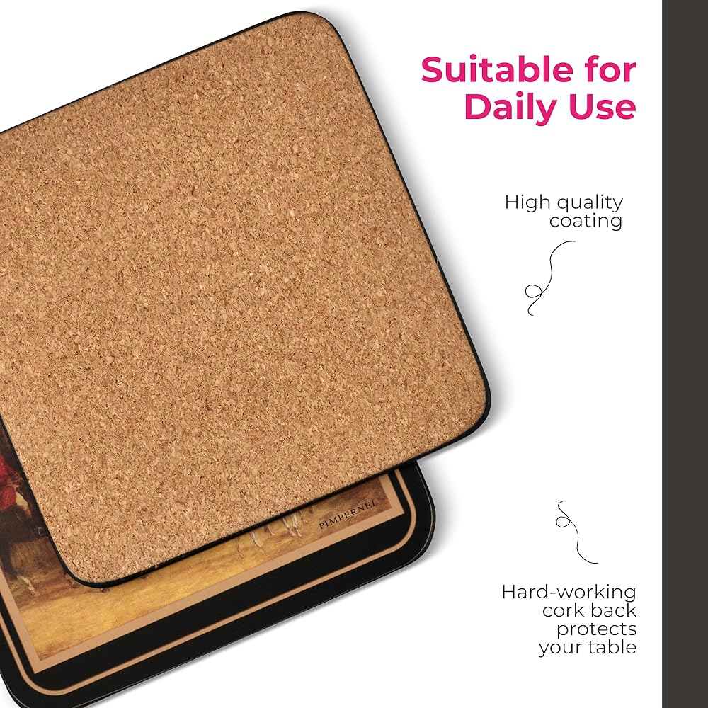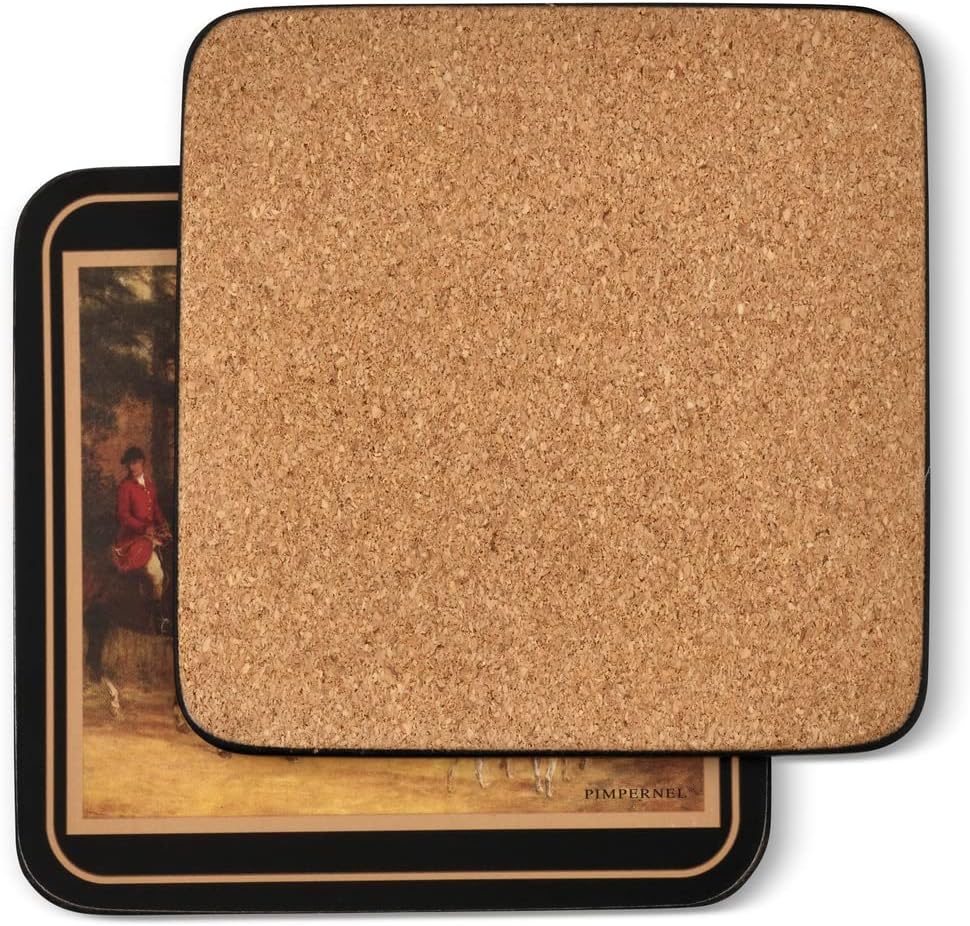 PRODUCT SPECIFICATIONS: Package contains (1) Pimpernel Tally Ho Collection Coasters - Set of 6. Made of Cork-Backed Board. Each Coaster measures 4 inches x 4 inches. Product Care: Clean with a damp sponge and dry with a soft cloth. Do not immerse in water.