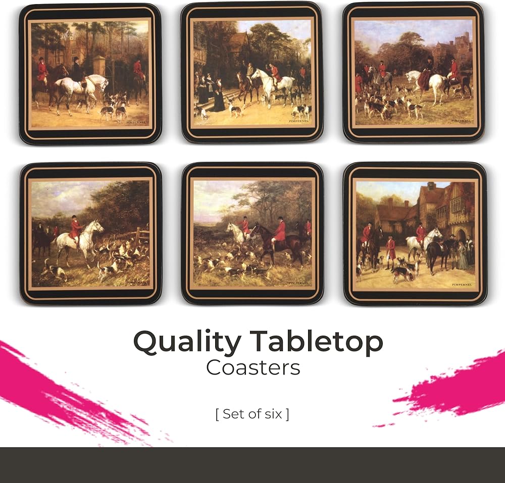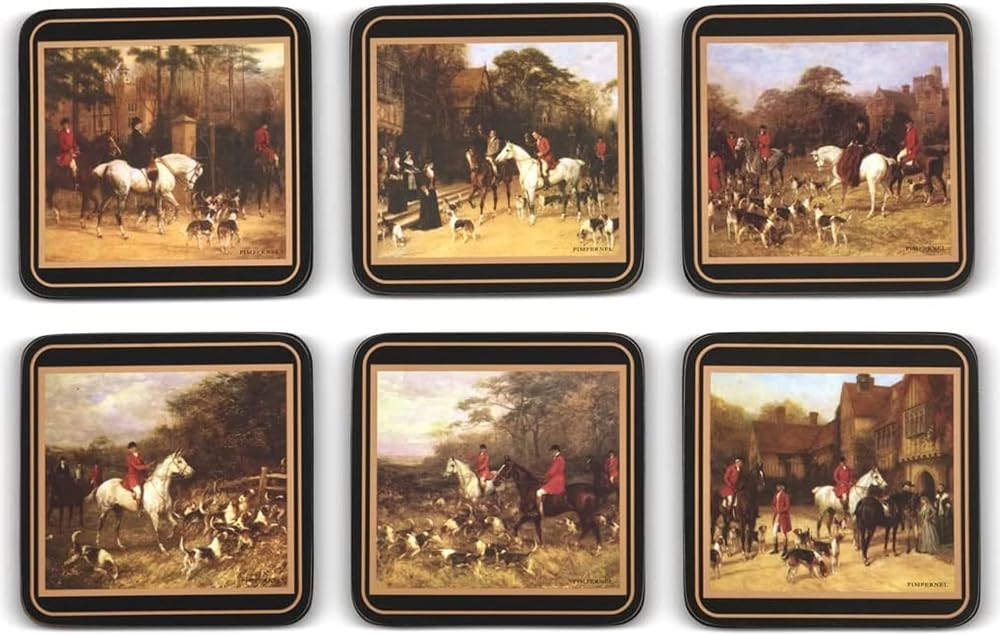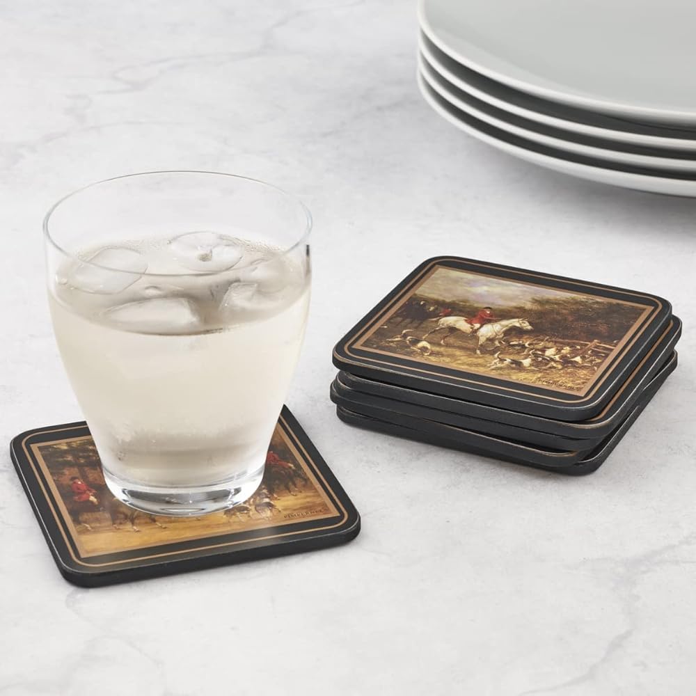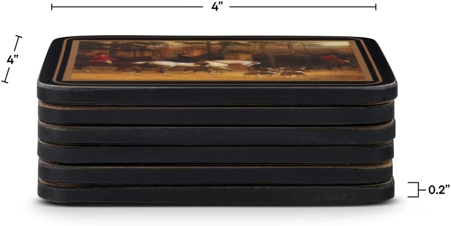 Pimpernel Tally Ho Coasters, Set of 6 Square – 4" Classic Hunting Scene Drink Mats with Black & Gold Borders, Cork-Backed Board, Heat & Stain Resistant Surface for Dining & Coffee Tables