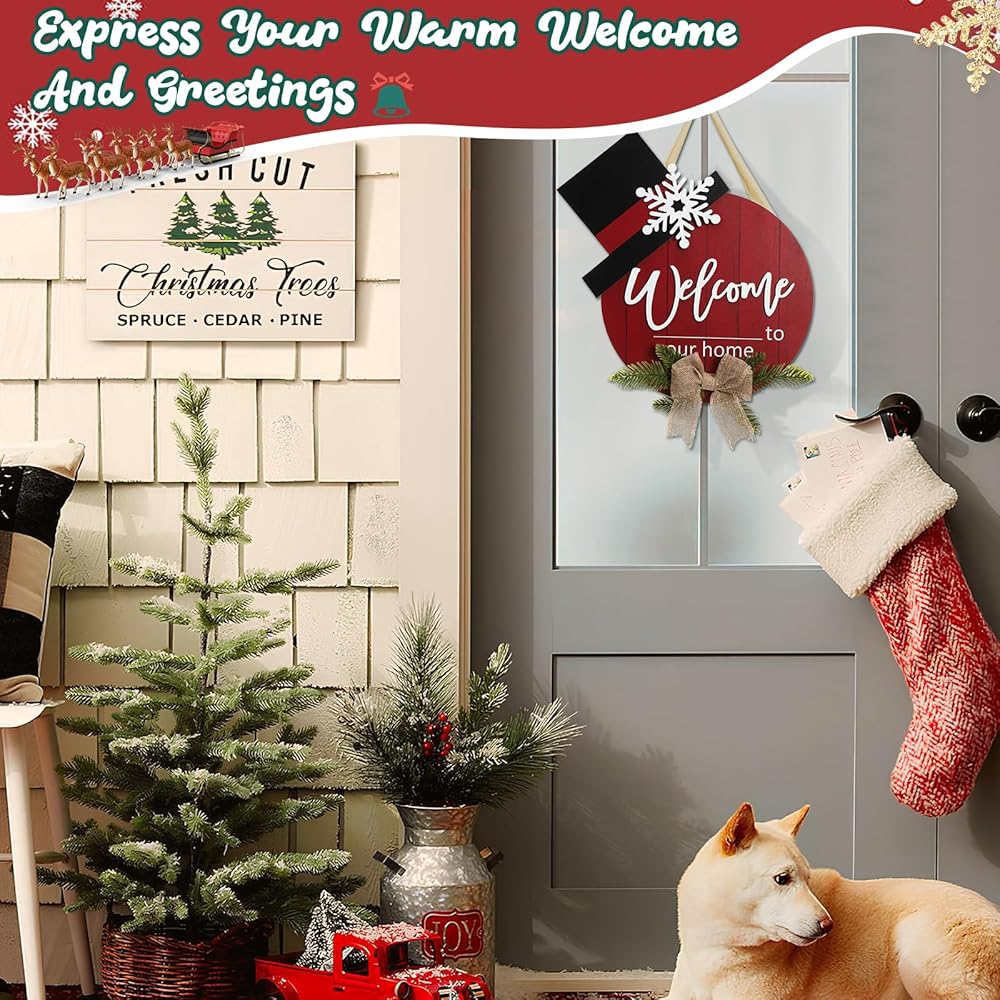 WIOR Christmas Wooden Hanging Sign, 12 Inch Round Welcome to Our Home Door Decoration Christmas Wreath Sign Rustic Welcome Sign for Front Door Farmhouse Porch Window Indoor Outdoor Home Wall Decor