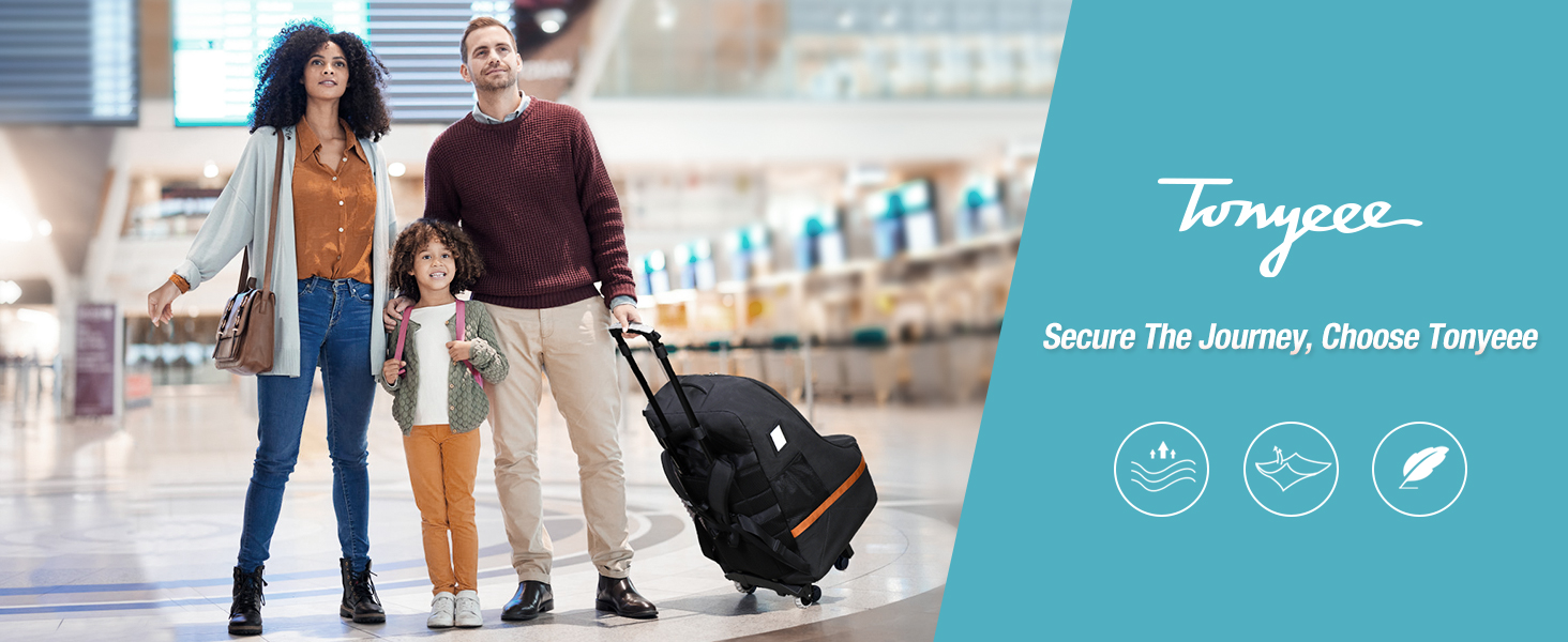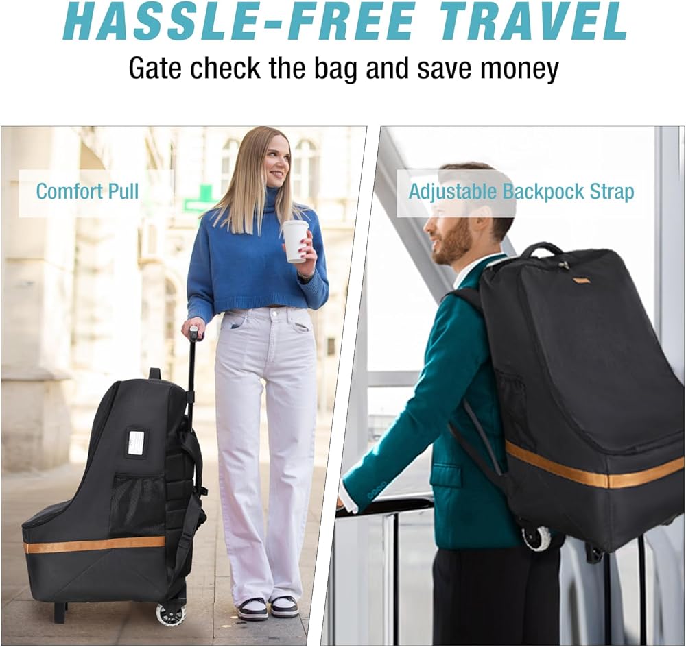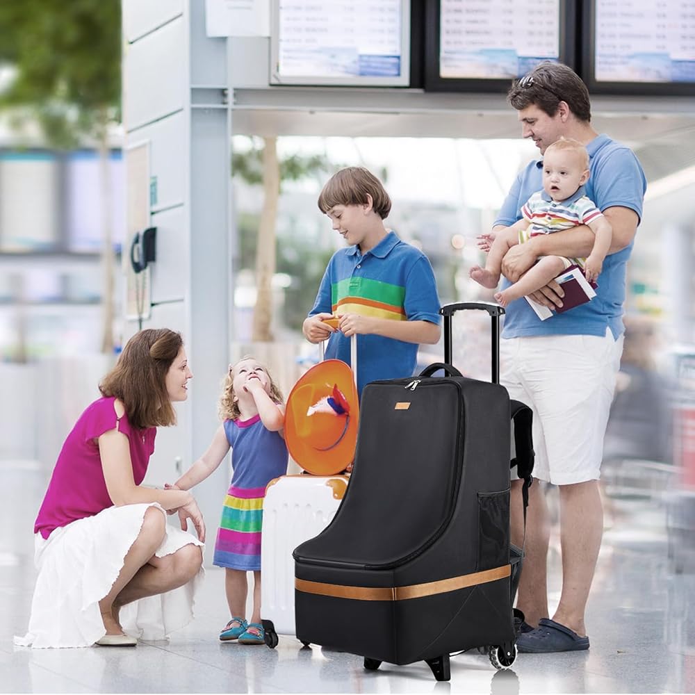 [Sturdy & Durable] Tonyeee car seat travel bag for airplane is equipped with a Lightweight industrial-grade trolley, sturdy rubber wheels that easily overcome rugged terrain. Front support prevents the cart from moving when not in use, allowing moms and dads to easily free up their hands.
