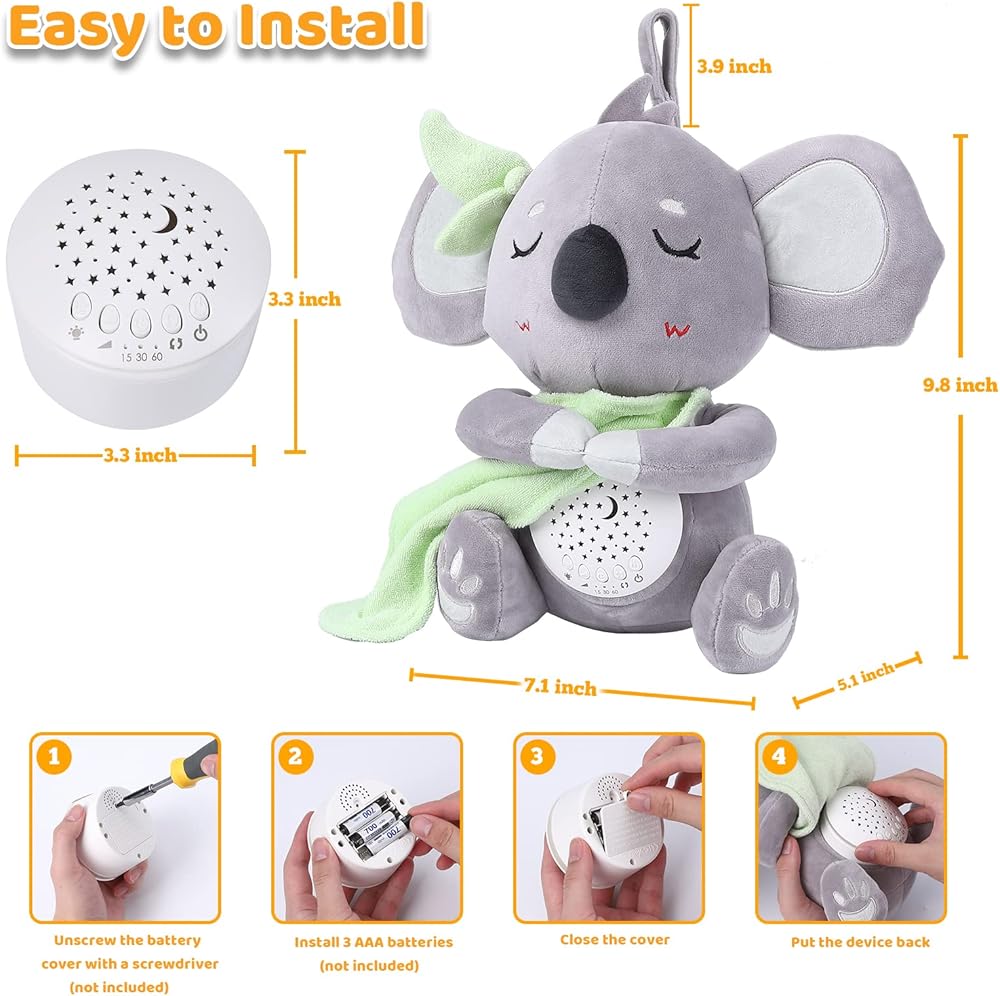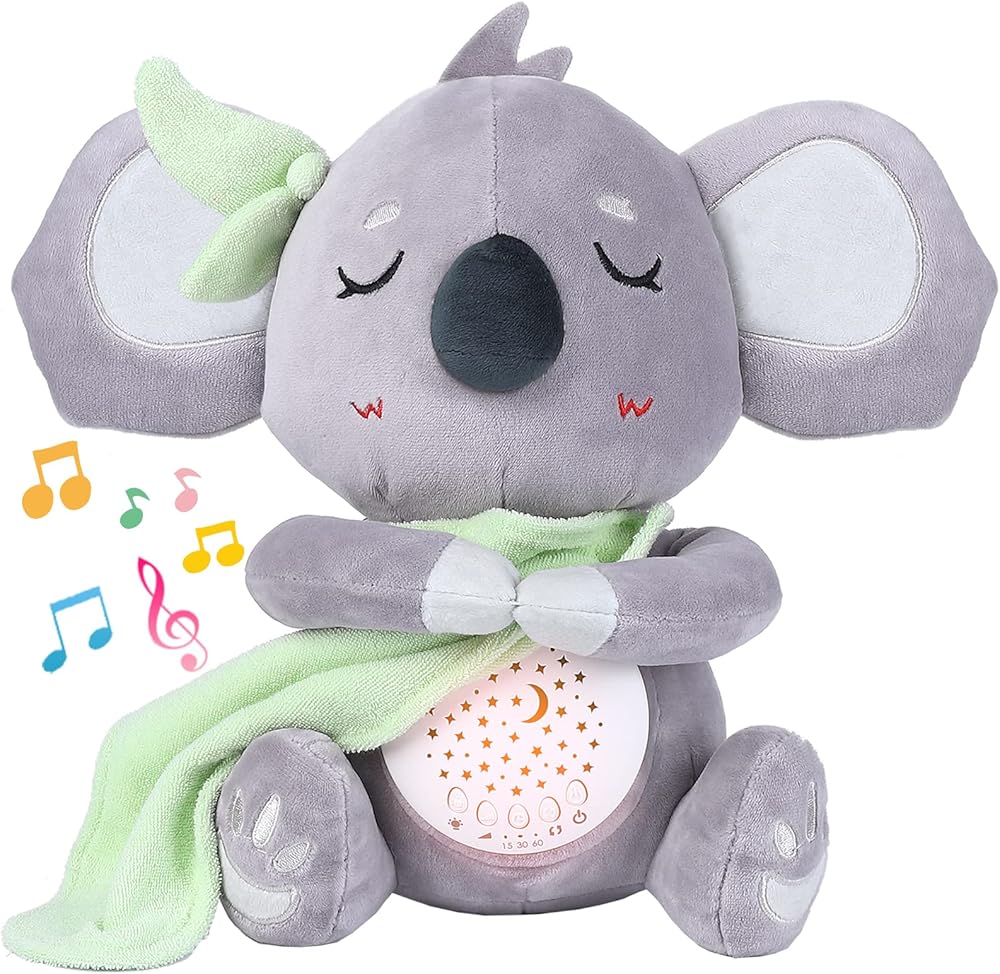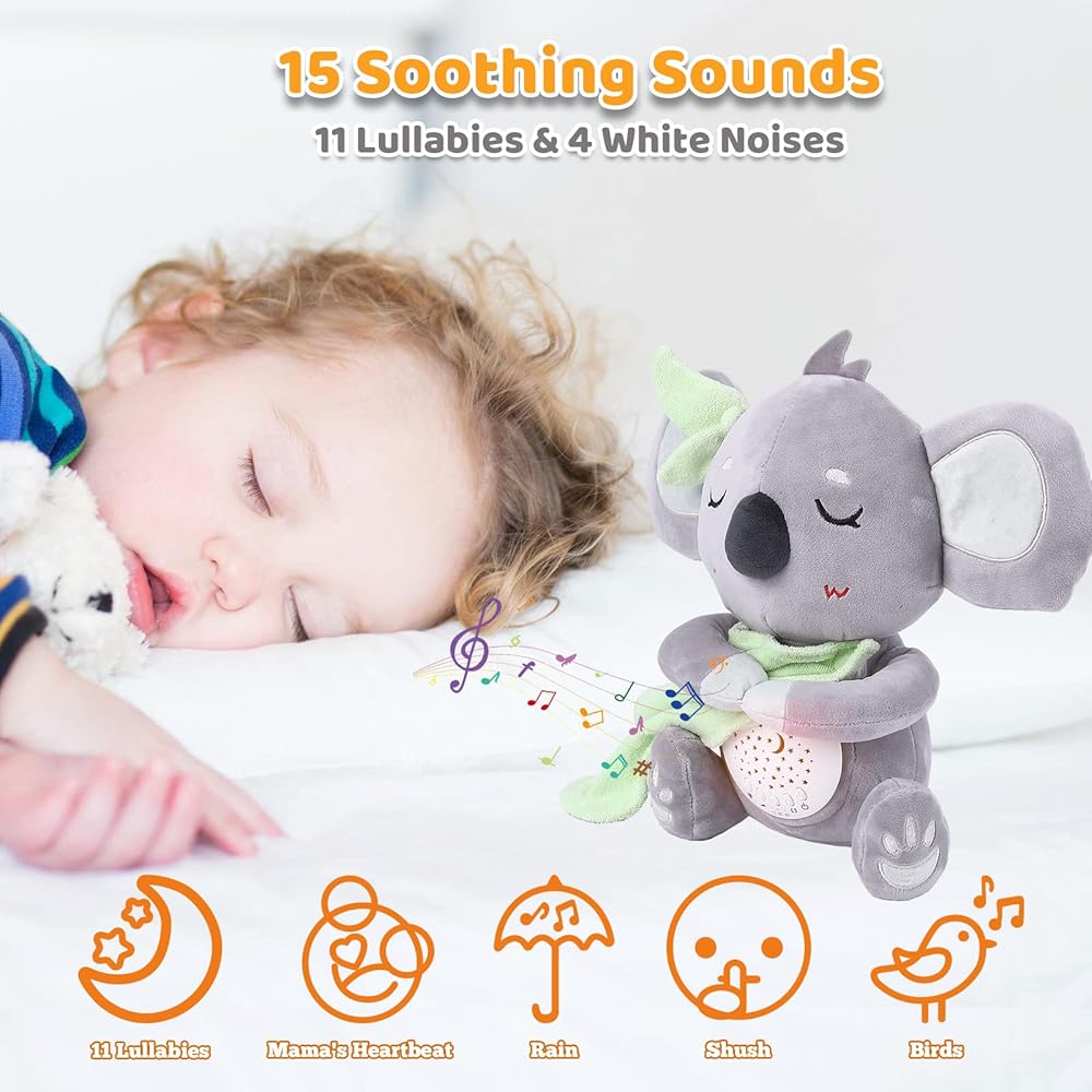MUTIFUNCTIONAL: Our baby sleep soother koala is a super soft plush toy with music, sounds, projector and night lights. Portable and cute design that your baby will love to cuddle, and help to calm and comfort baby.