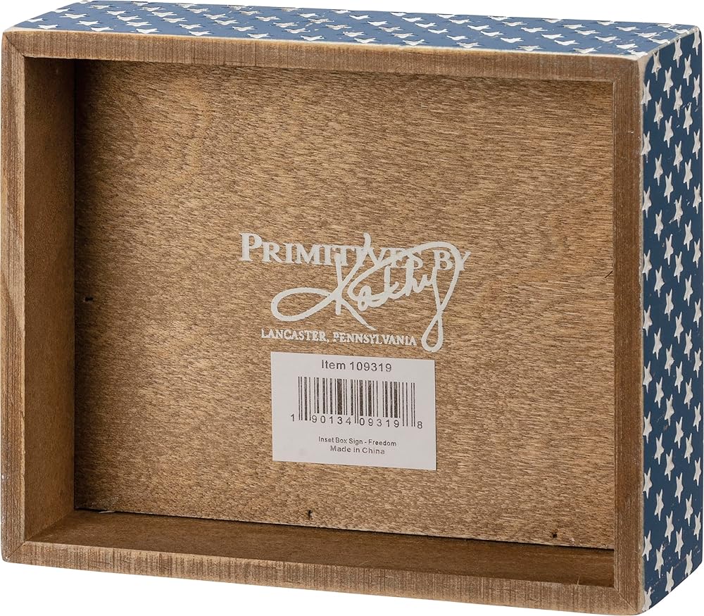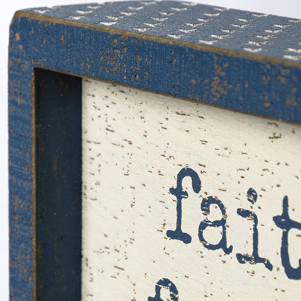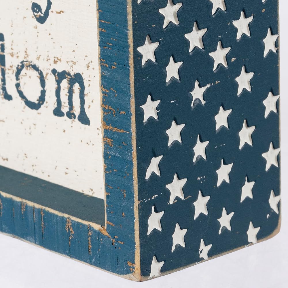 A framed wood home décor sign featuring "Faith Family Freedom" sentiment on a distressed white background. Includes debossed star designs on blue sides for added interest. Easy to hang or can free-stand alone.