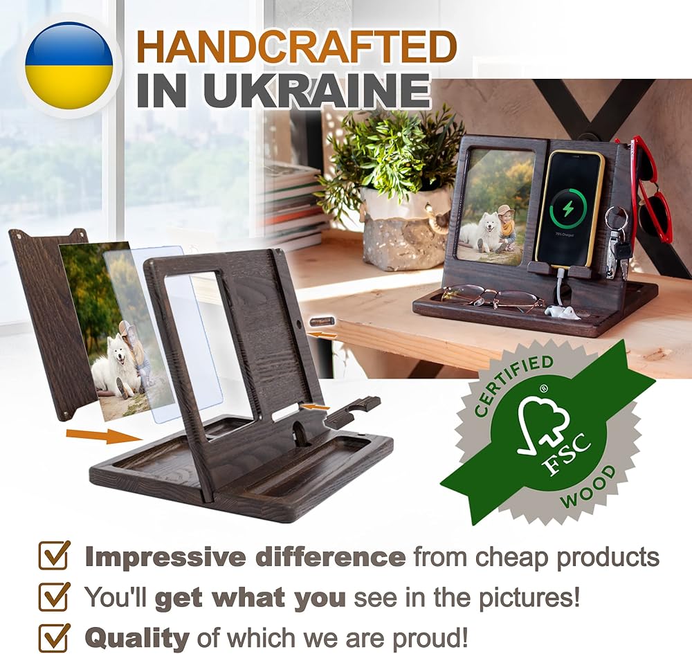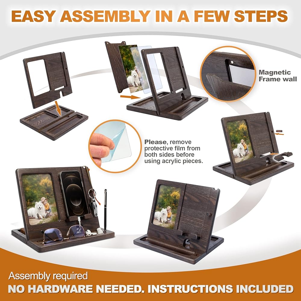 SPECIAL PLACE FOR PHOTO AND ENOUGH SPASE FOR PHONE: Size assembled: 9,84*8,27*8,27 inch (25*21*21cm) For convenient use we designed magnetic photoframe back cover - super easy to assemble.Please note! Accessories shown in the pictures are not included!