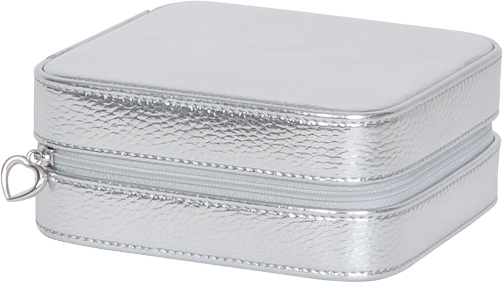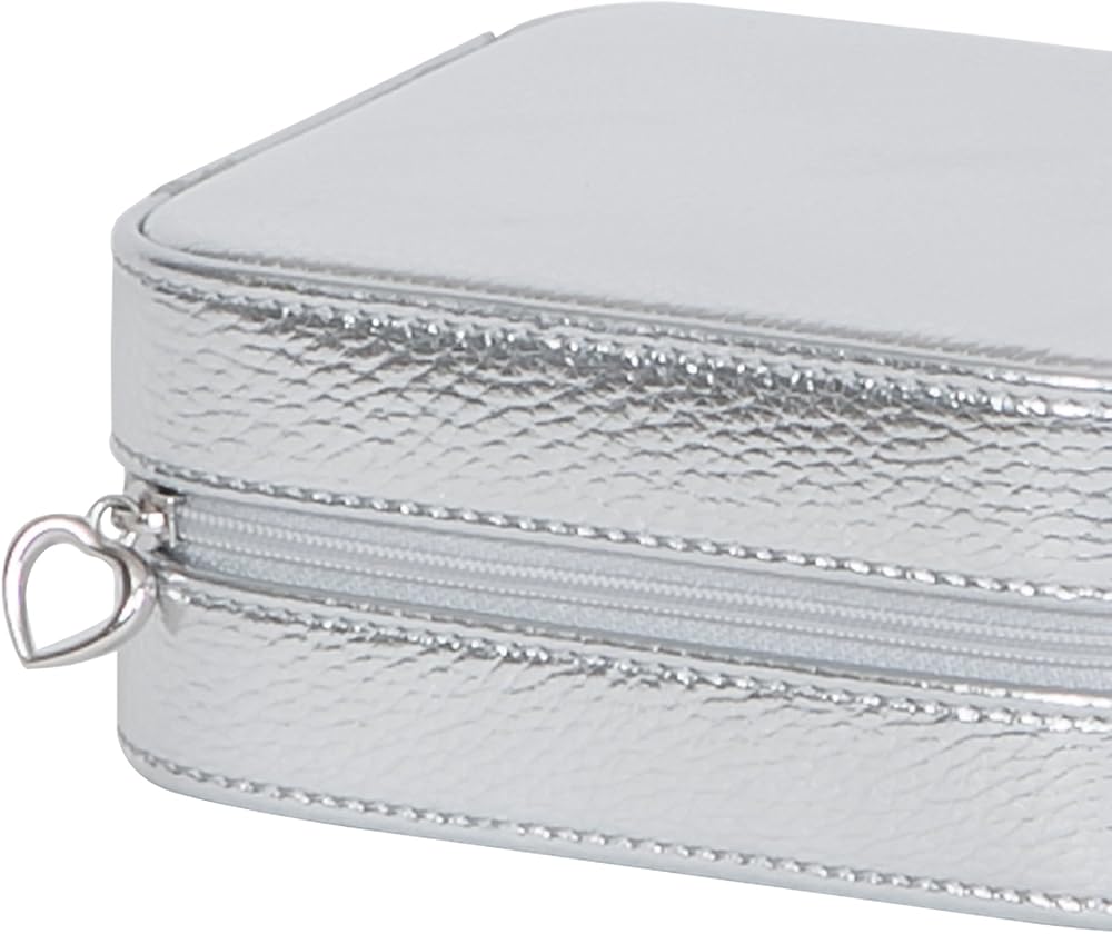 With enough storage to keep your favorites near to hand, the Mele & Co. Luna jewelry box is pretty and practical. Unzip the case to find four sections for earrings, rings, and smaller items, as well as ring rolls and a mirrored divider. Pull the tab on the mirrored divider to reveal a compartment with a removable drawstring pouch ideal for storing delicate chains or larger pieces. Luna is made of metallic gold faux leather and is hand lined in ivory sueded fabric. The jewelry box features a secure zippered closure with a heart shaped pull. This jewelry case is a tried and true traveling companion. Dimensions: 5 1/8" W x 5 1/8" D x 2 1/4" H.