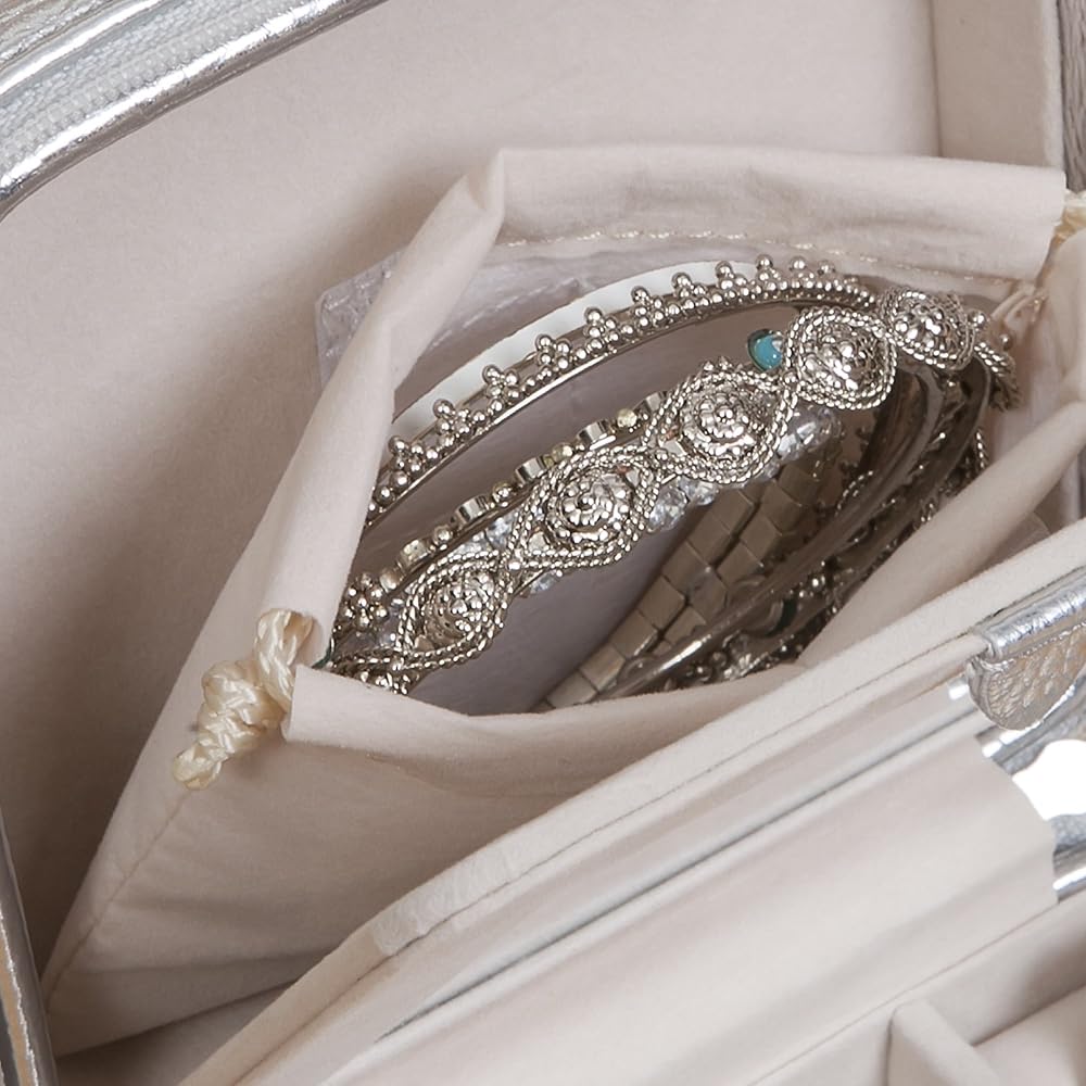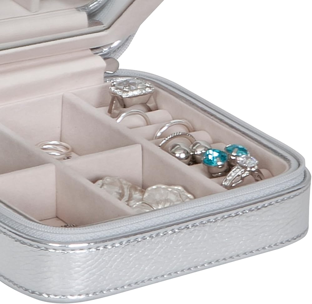 SOPHISTICATED STYLING: Mele & Co.'s Luna travel jewelry box is made of metallic gold faux leather with an ivory sueded fabric interior Mirrored divider Removable drawstring pouch for larger accessories 4 equally sized sections plus ring rolls Zippered closure with heart shaped pull