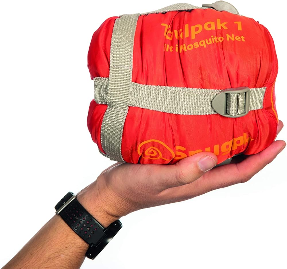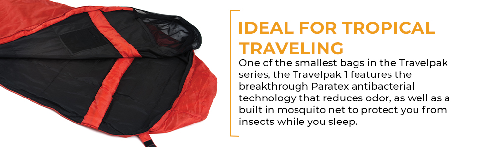 The Snugpak Travelpak 1 sleeping bag is ideal for a wide range of climate conditions and designed for convenient travel. The Travelpak 1 comes with a compression stuff sack and packs down to a travel-friendly 7 inch by 6 inch bundle. The comfort temperature rating of this sleeping bag is 45 degrees Fahrenheit with a low of 36 degrees Fahrenheit for experienced campers and outdoor enthusiasts. The Travelpak 1 showcases Snugpak's breakthrough technology with Paratex treated fabric, which offers odor resistant properties. The Travelpak 1 is also equipped with a built-in mosquito net that can be rolled away or zipped over your face, sealing the sleeping bag and offering you protection against mosquitos and other biting insects. The sleeping bag's dimensions are 87 inches long and 31 inches wide; it weighs 1.88 pounds. Hex rip stop nylon ensures the sleeping bag's durability while the Travel Soft filling will keep you comfortable with minimal bulk and will not lose its thermal properties over time due to compression packing. The Travelpak 1 also features a full length zipper and a zippered internal chest pocket so you can keep important items close to you.