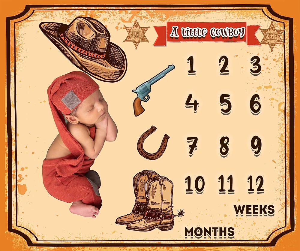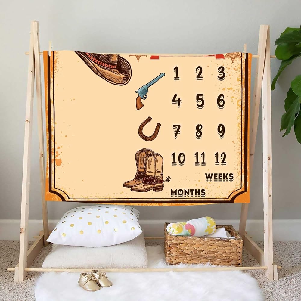 Western Cowboy Baby Monthly Milestone Blanket Country Leather Boots Cowboy Hat Newborn Photo Props Baby Shower Party Decor New Baby to 12 Months Growth Calendar Blanket 48x40 inch BTZYKI82