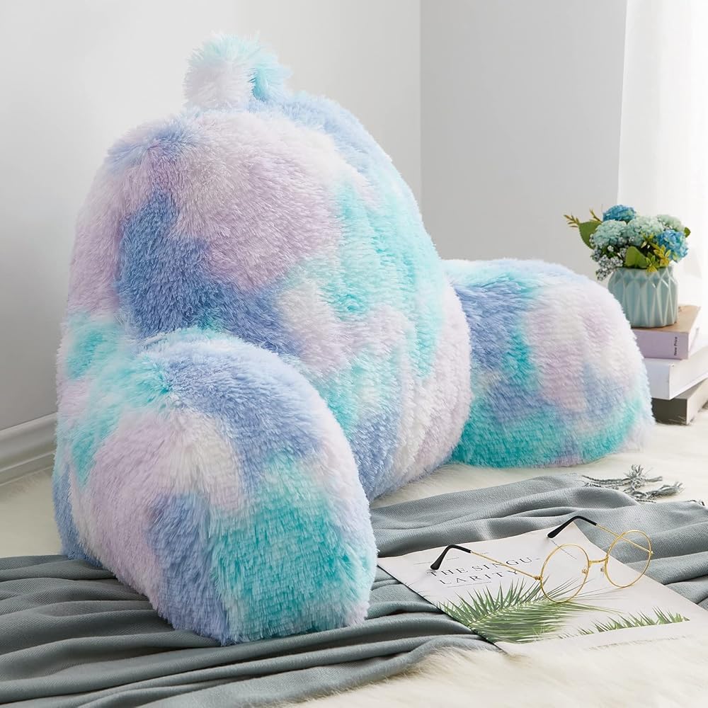 Reading Pillow for Bed Adult - Faux Fur Backrest Pillow with Arms, Ergonomic Back Rest Pillow for Sitting Up in Bed, Extra Fluffy Sit Up Pillow, Students, Teens, Kids Study Pillow, Xmas Gift