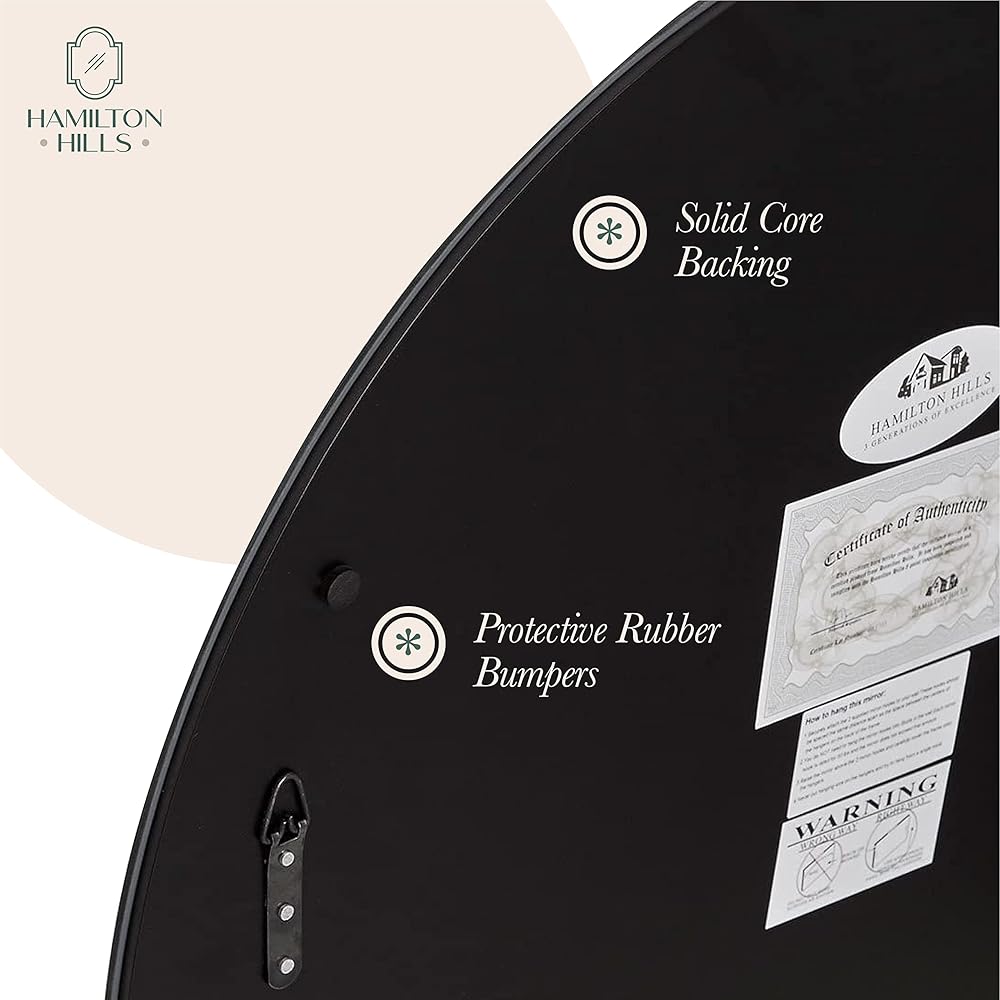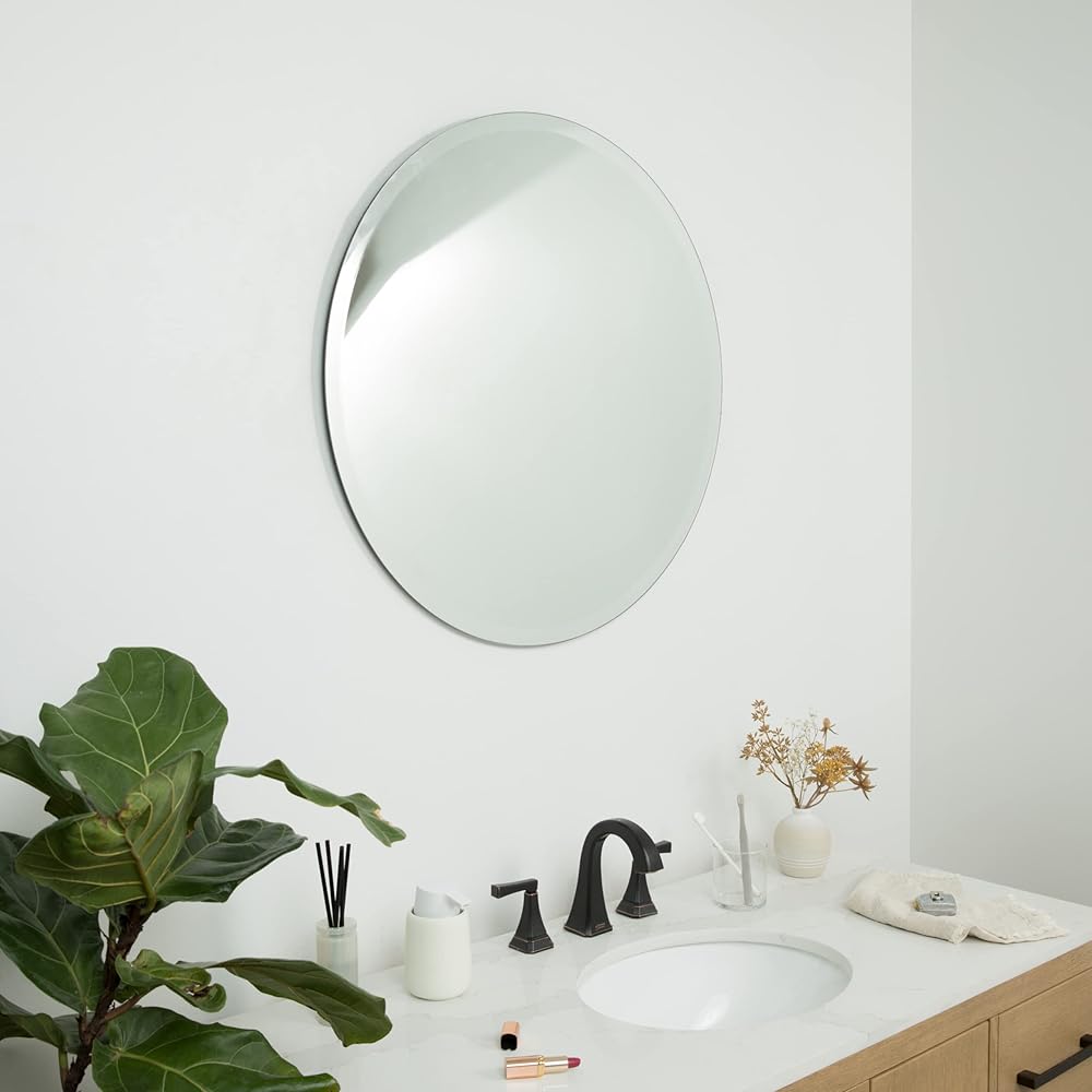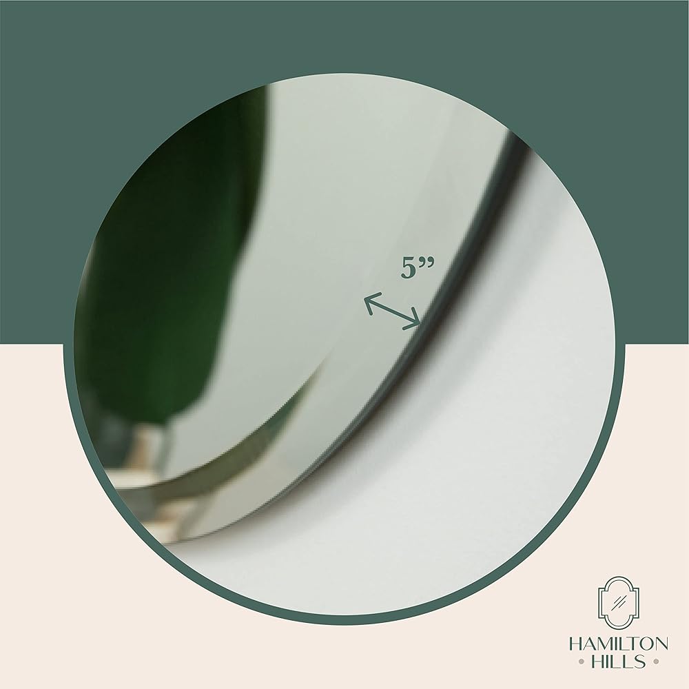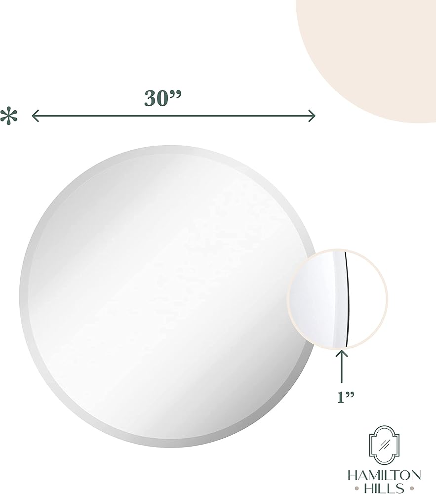 Hamilton Hills Large Simple Round 1 Inch Beveled Circle Wall Mirror Frameless 30 Inch Diameter Circular Mirrorwith a Rounded Mirrored Glass Panel Best for Vanity, Bedroom, or Bathroom (30" x 30") Our simple circular 30 inch round mirror is perfect for hundreds of styles and locations. Whether you are looking for a bathroom, powder room mirror or something in your dining or living room, our rounded circle beveled plate glass mirror is the perfect solution. Our beveled mirror comes secured to a solid wood backing to add stability and prevent distortion or warping. The wood backing includes our pre-installed slimline 1/4 inch hanging hardware hooks for hanging your mirror easily. The center circle plate glass portion is surrounded by a simple 1 inch bevel to add some flair. The backing is offset an eighth of an inch from the edge to give that floating, clean look while still offering security and support. We stand by our products and your happiness with a 100% money back guarantee. USA Company with 3 Generations of Family Values.
