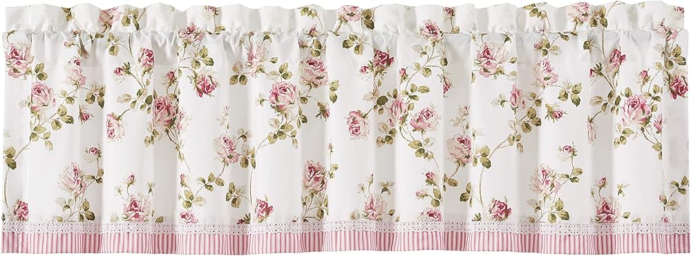 The ROSEMARY Straight Valance's classic floral design creates an atmosphere of vintage elegance. This printed white and pink floral is just lovely. Embellished with a striped band and delicate lace this valance is the perfect finishing touch to your window.