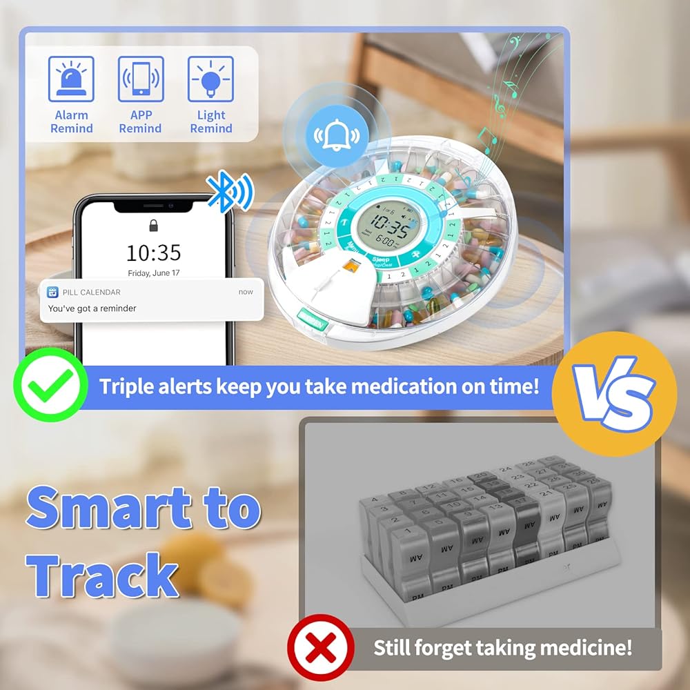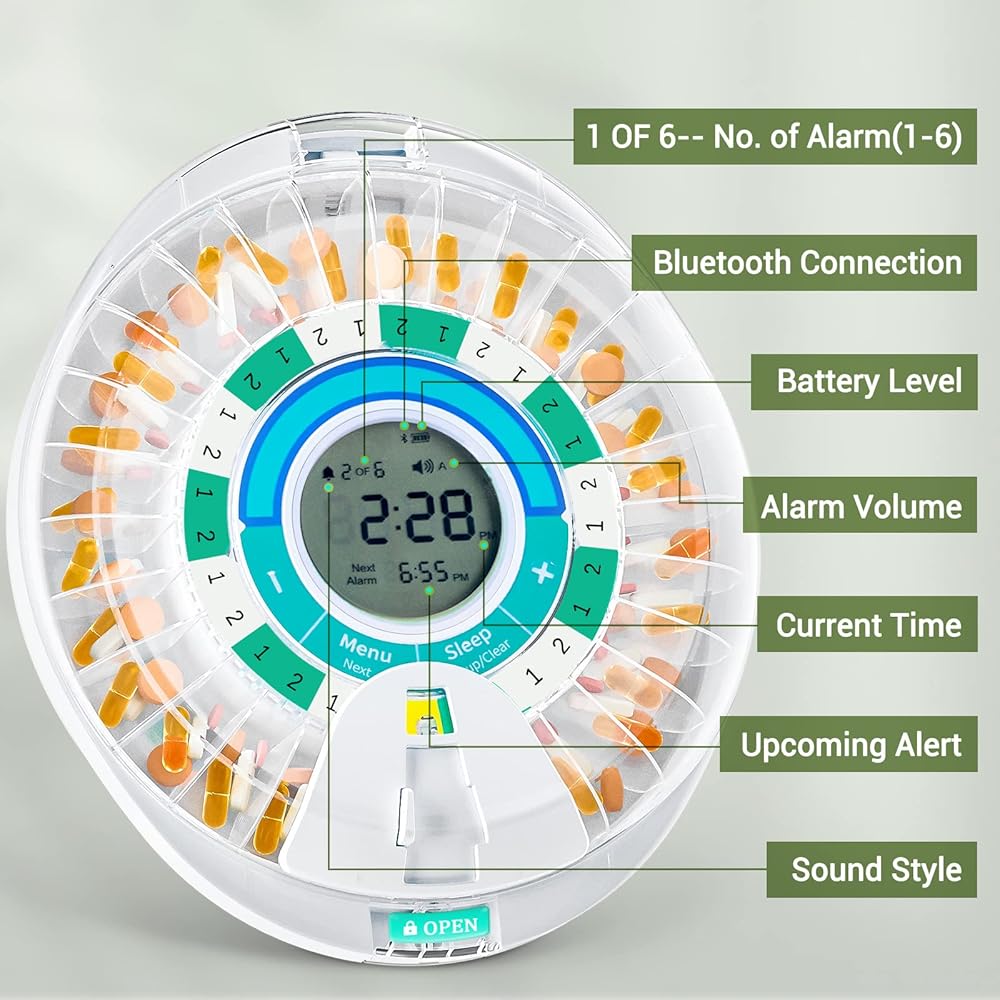 [Smart to Track] Set reminders up to 6 alarms via smart app. When alarms ring with light flashing, the medication dispenser will automatically dispense your medicine of you dose of medicine at the right time. No overdrug or missing doses. The clear lid helps monitor medicine or supplements visually as well.