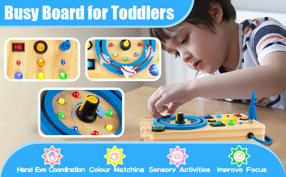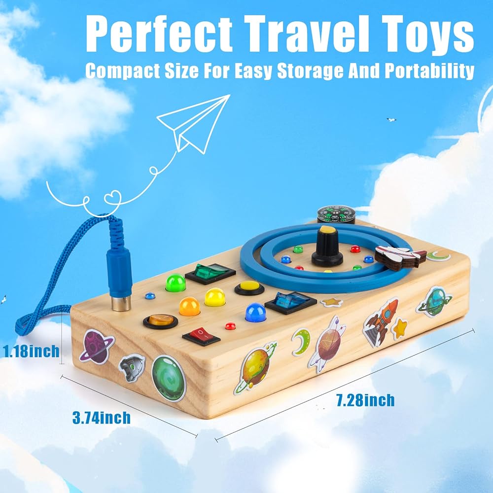 🎁【Learn and Play】This light switch toy is the perfect birthday Christmas gift for kids. Toddlers can use this toddler busy board to recognize different colors and sizes. This sensory toy can exercise baby's thinking ability and hands-on ability.The brightness of each LED is adjusted to be just right for the baby, not too bright, too dazzling or too dark to see clearly. Your children will be entertained for hours with this wooden sensory toys,and it does not hurt the eyes.