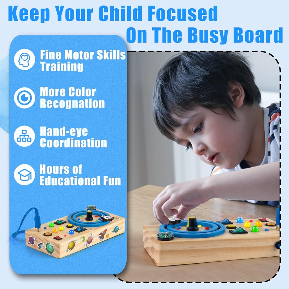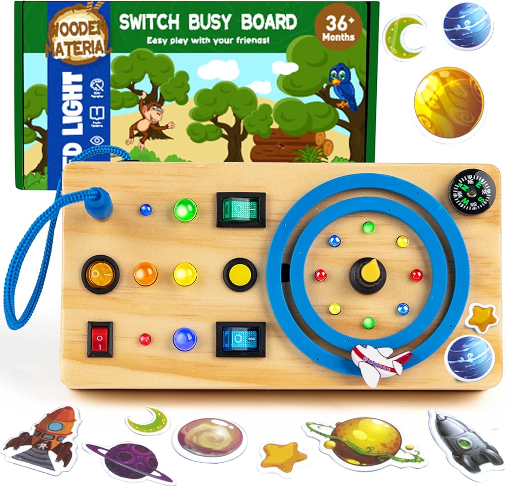 Biulotter Montessori Busy Board for Toddlers, Wooden Sensory Toys for Toddlers,Busy Board with LED Light,Travel Toys for Educational Toddler Activities,Boys & Girls Educational Learning Fidget Toy