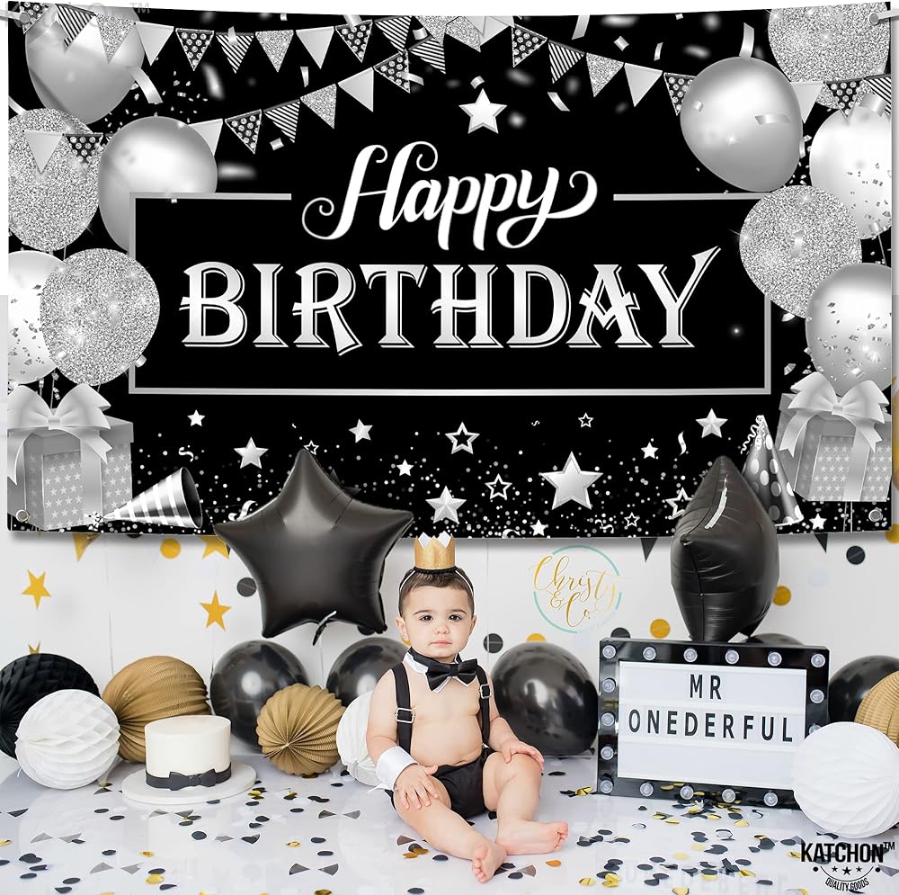 KatchOn, Black and Silver Happy Birthday Banner - 72x44 Inch | Backdrop Banner for Happy Birthday Decorations | Birthday Party Decorations for Women, Men | Happy Birthday Backdrop, Happy Birthday Sign