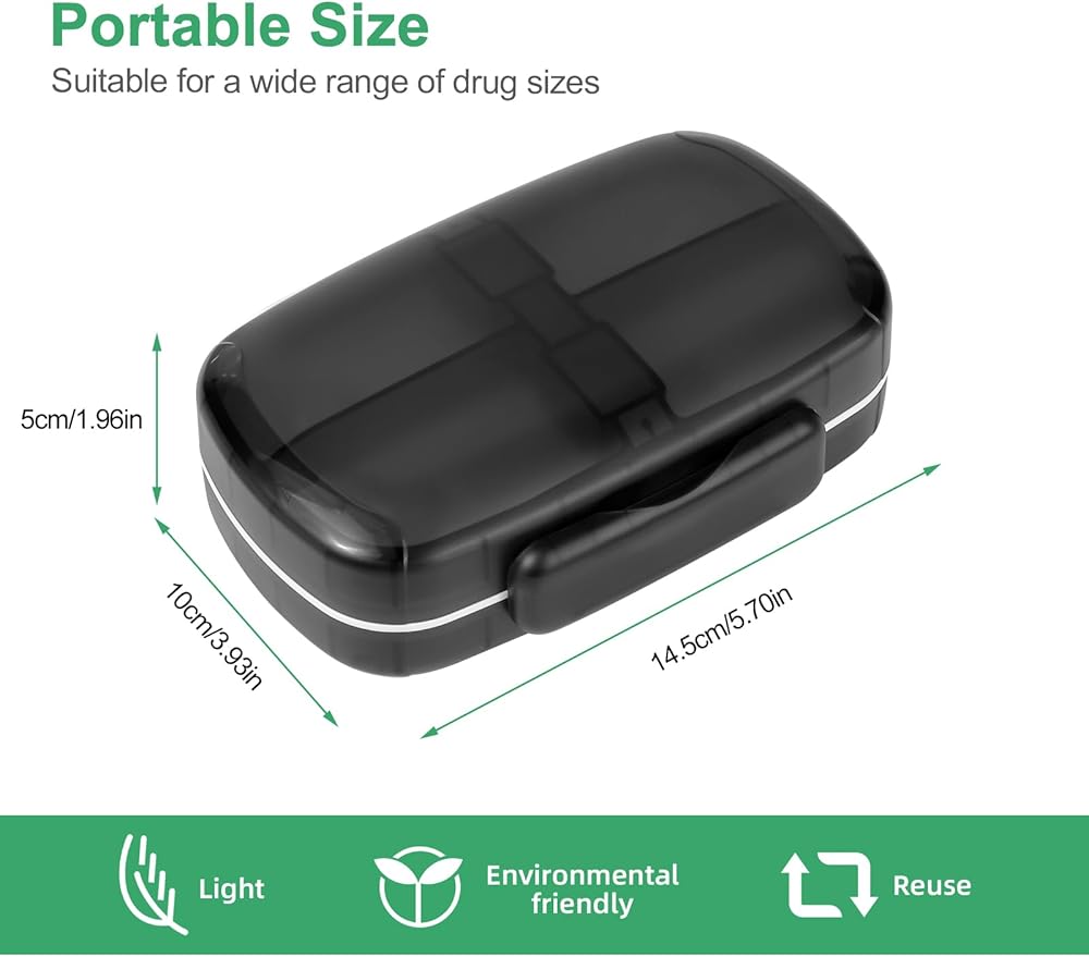 Adaptable 8-Compartment Design: This daily pill organizer features 8 compartments tailored for various pill sizes. Four larger compartments, each measuring 2.3" x 1.4" x 0.6", accommodate pills of different sizes. Three compartments, each measuring 2.6" x 1.0" x 0.6". In addition, a roomy central compartment measures 5.3" x 2.6" x 0.4". This design ensures easy organization for pills of all sizes, perfect for daily and travel needs.
