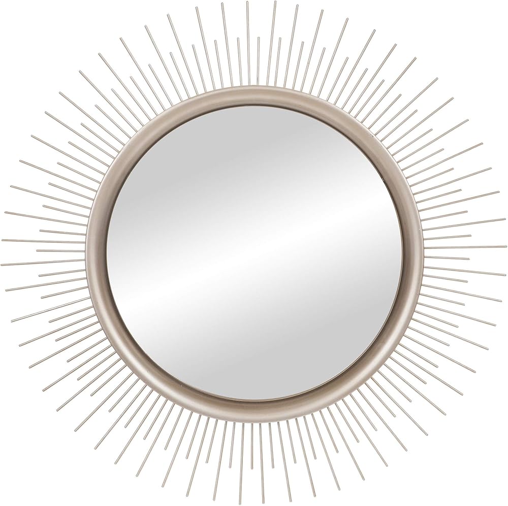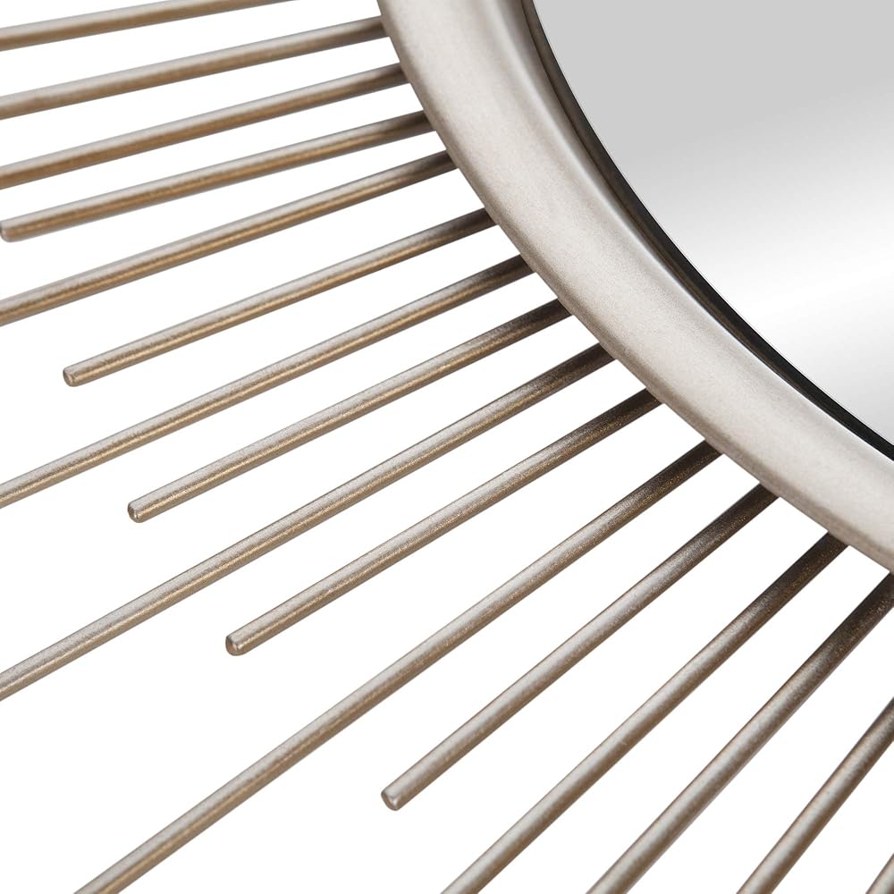 Add a clean modern element to your decor with this Brushed Silver Sunburst Wall Accent Mirror. Inspired by the 1960's, this mirror adds a modern twist to a classic retro style. It measures 27.5 inches all around and the reflective surface measures 14.5 inches. Hang it securely to any wall with industrial hangers on the back. Unique enough to add as an accent piece to your midcentury decor, yet large enough to make for a focal point above the mantel. Mirrors provide the illusion of a larger space while also adding bright reflective shine. This mirror is no exception with it's playful yet contemporary design.