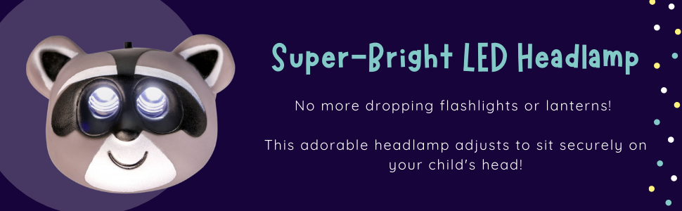 SAFE CHRISTMAS TOYS FOR KIDS: This safe holiday toys for kids is made of kid friendly material, with 15-20 lumens, this racoon headlamp runs on 2 AAA batteries (not included) for a 6-8 hour steady run time. A great Christmas gifts under $25 or holiday gifts under $25.