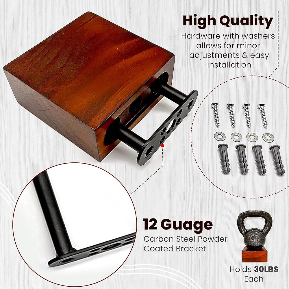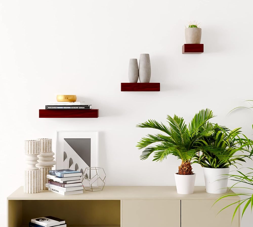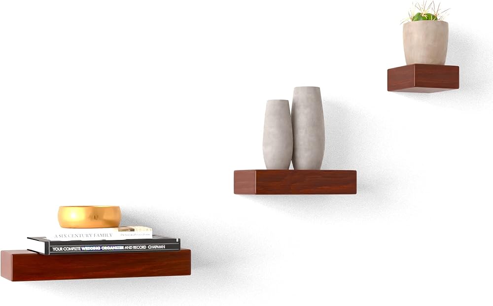 Ninefold Design Solid Wood Size Variety Floating Wall Shelves Home Decor in Mahogany Color, Holds 30 Ibs Each Easy Installation for Living Room, Bedroom, Bathroom, Kitchen, and Office.