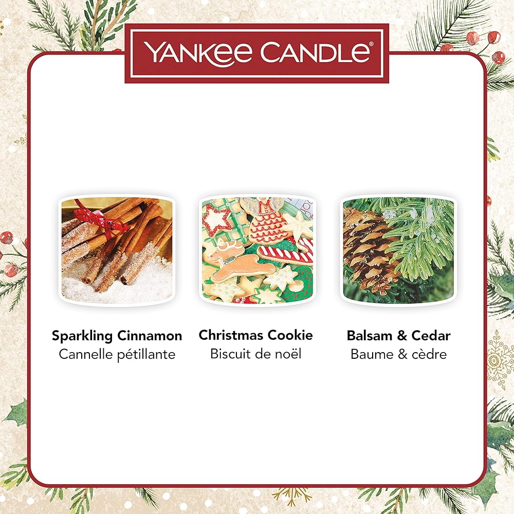 Fragrances: Balsam & Cedar (citrus, pine, vanilla), Christmas Cookie (vanilla, nutmeg, butter) and Sparkling Cinnamon (cinnamon, clove, bay leaf)