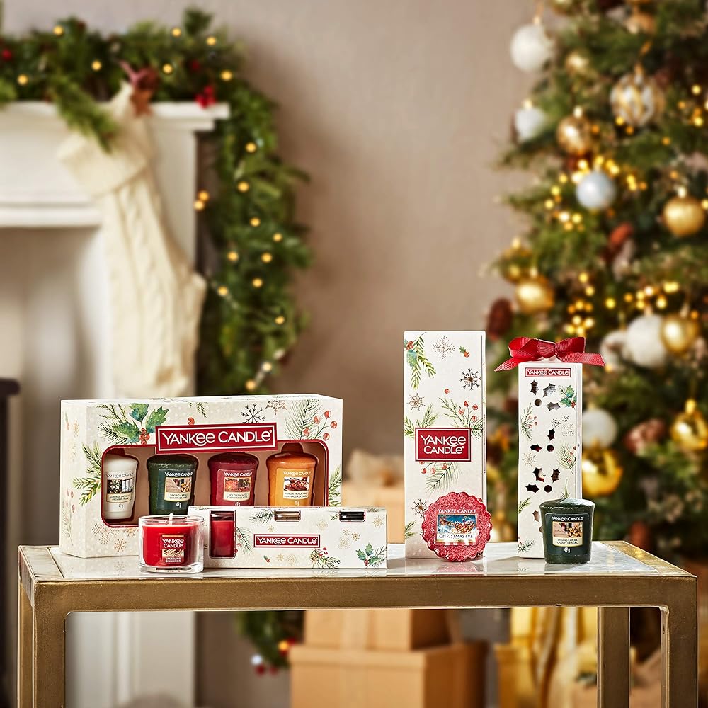 A festive trio of 3 Yankee Candle Minis scented candles in a beautifully decorated gift box, ready to give straight away and ideal for spreading Christmas cheer