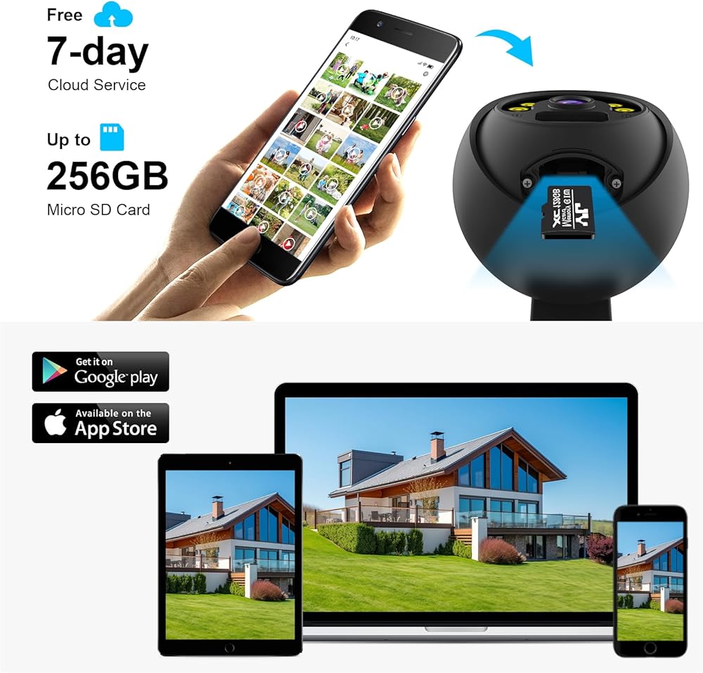 【360° Coverage & Motion Tracking】The indoor/outdoor security camera is designed as a PTZ WiFi camera with panoramic viewing angles, almost 360° field of view with automatic motion tracking. You will receive instant notifications on your phone when a person or movement is detected in your home. You can also easily pan and tilt it via APP, never miss any corners.