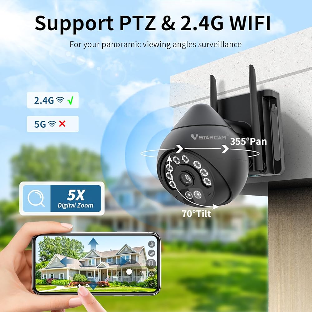 【4MP HD WiFi IP Camera】VSTARCAM security camera with 4MP Full HD resolution, VSTARCAM home camera shows a crystal clear smooth live video, you can keep an eye on your house anytime and anywhere. The camera works with 2.4G WiFi (5G is not supported), 4dBi dual antennas ensure a stable connection of the camera to the WiFi, you don't need to lay a network cable