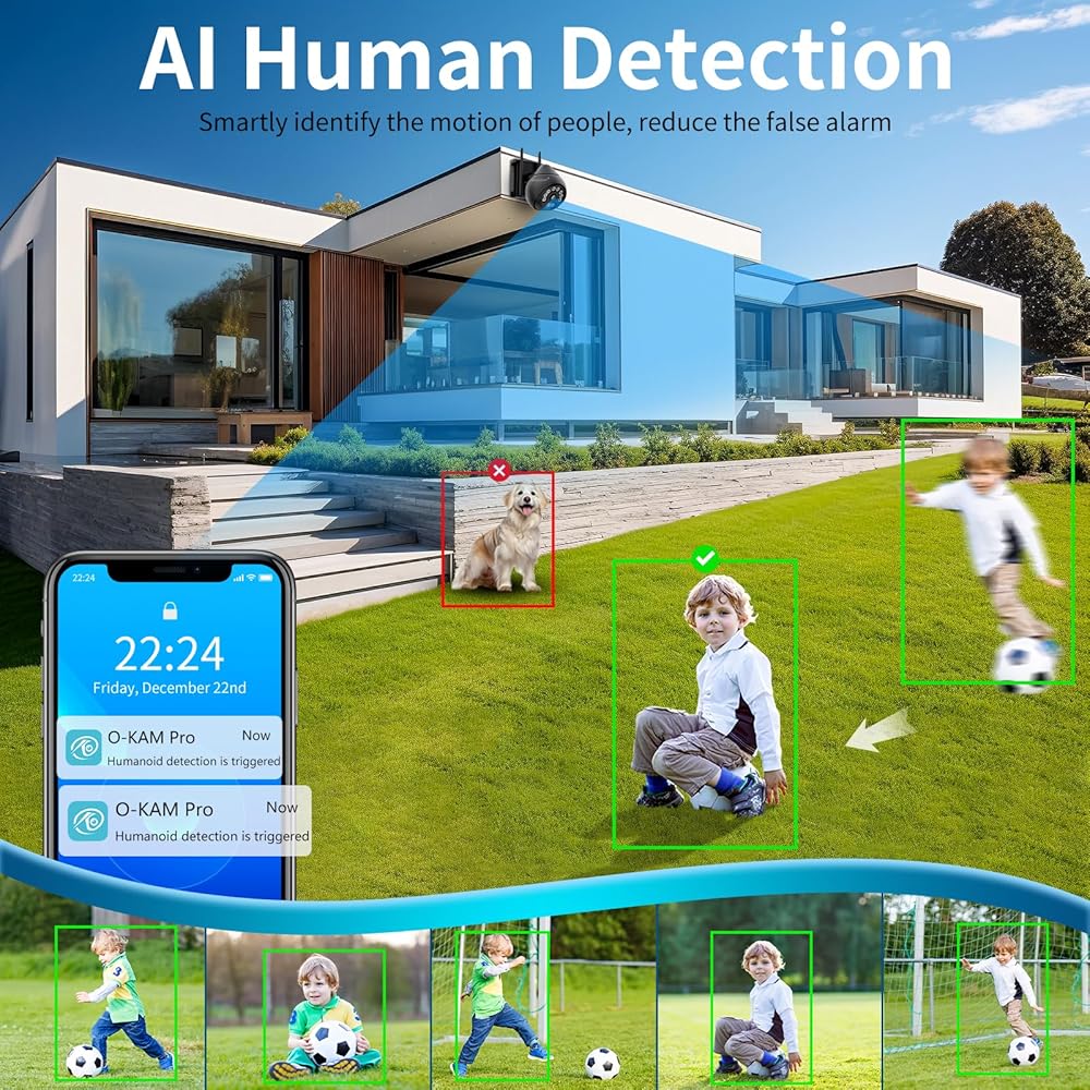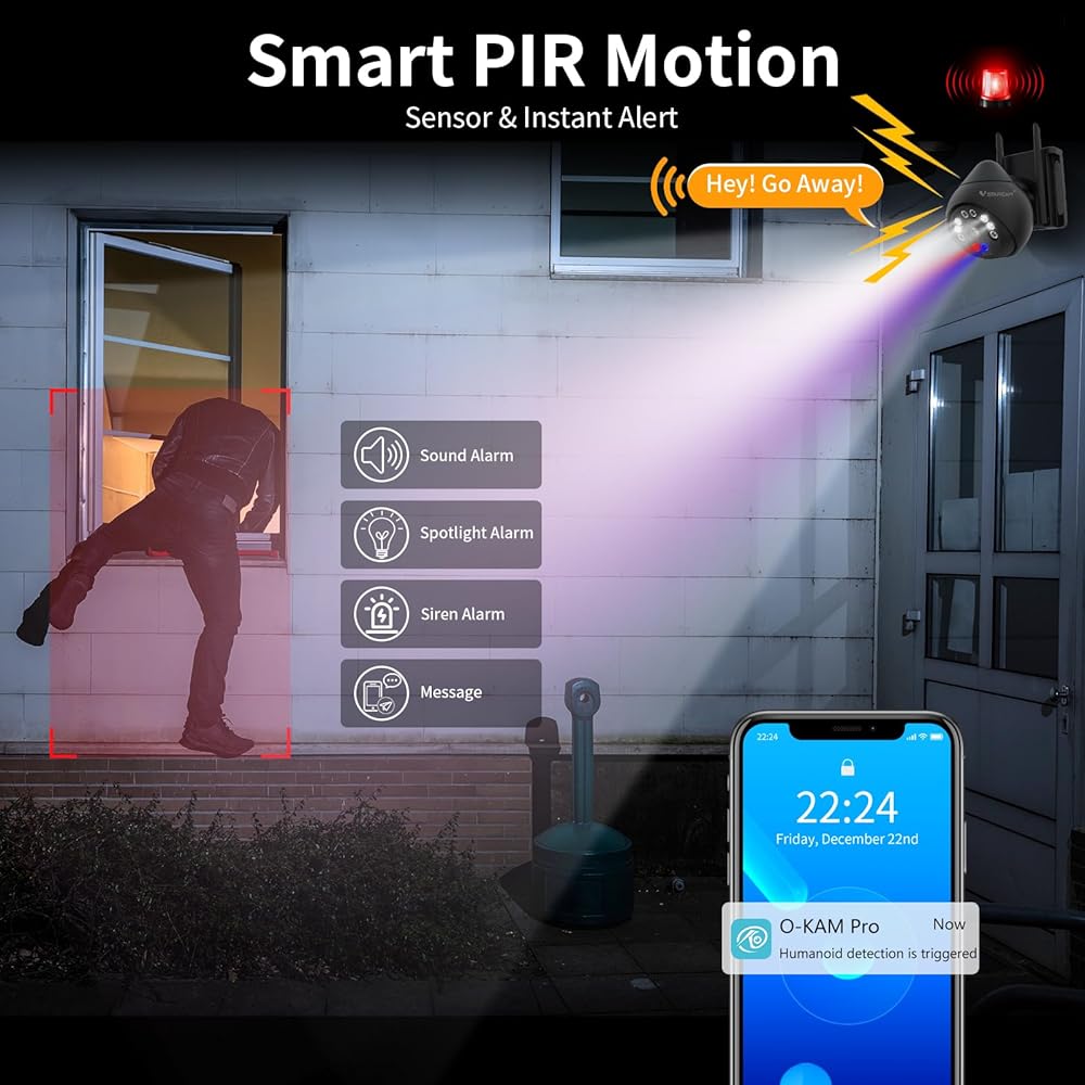 【Detection Area & Voice Floodlights Alarm】Detection Area & Voice Floodlights Alarm】When creating a Detection Area, you can set up detection lines to warn visitors before they enter. You can also record your own alarm sound that will automatically sound when the camera detects an intrusion. The alarm message will be sent to you via O-kam APP.