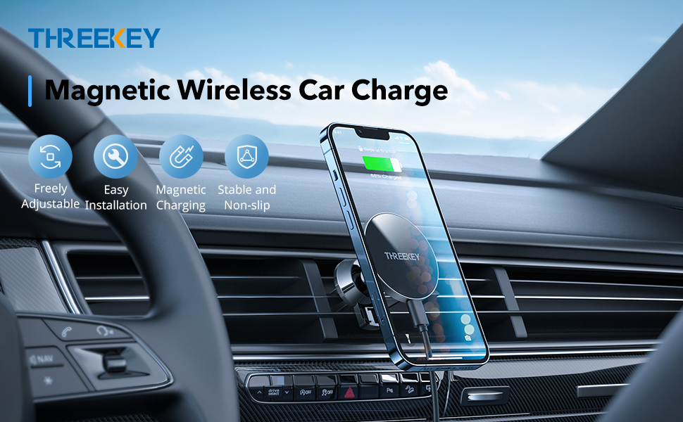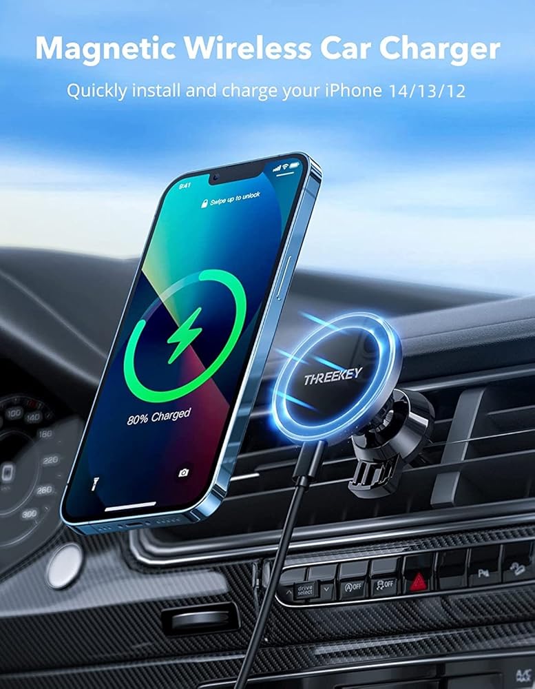 Compatible with Magsafe Car Mount Charger,THREEKEY Magnetic Wireless Car Charger Mount Vent Hook Phone Holder for iPhone 15/14/13/12 Series Phone & MagSafe Case(with QC3.0 Adapter)