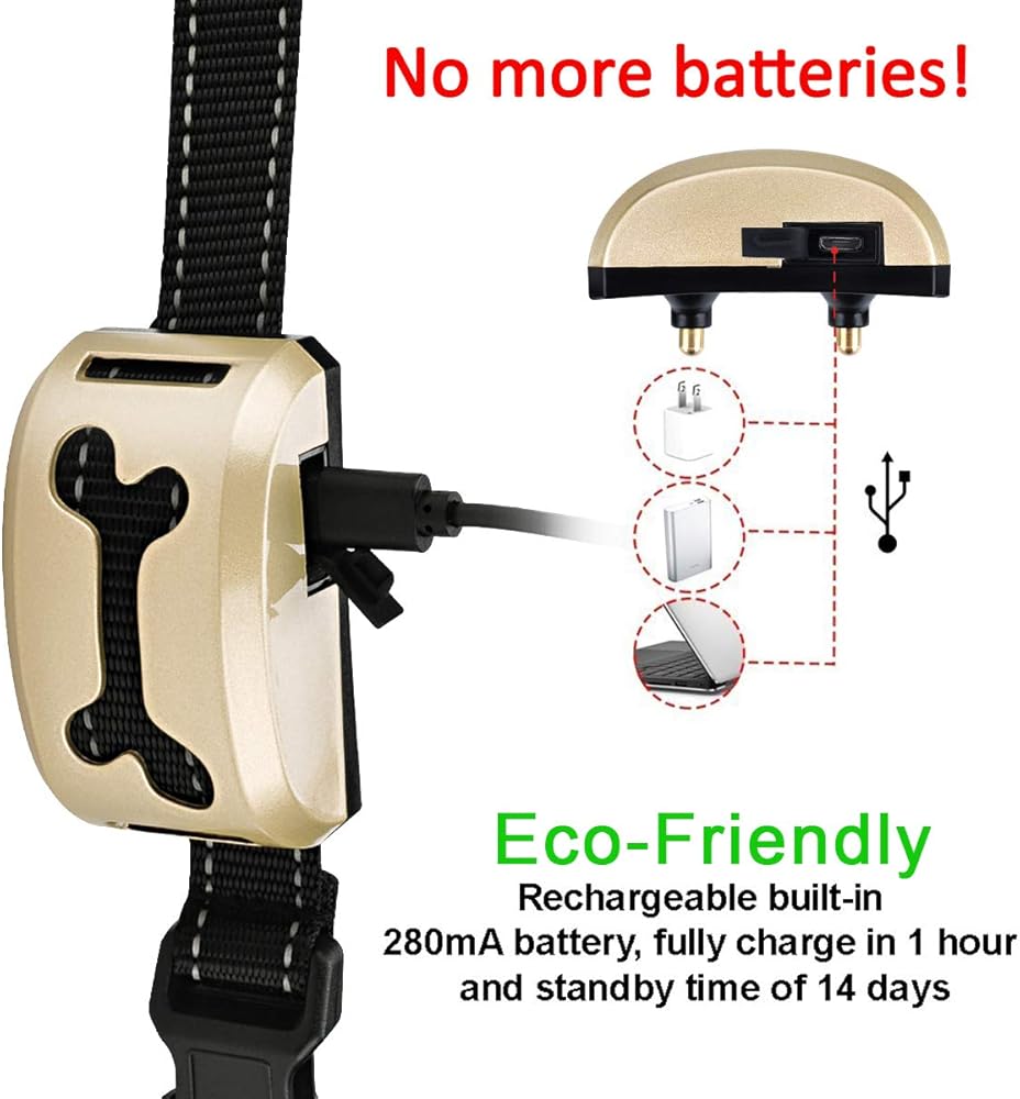 ✅USB Rechargeable and Waterproof - Each no barking collar contains a built-in USB Li-Poly rechargeable battery and 1 hour of charge time gives you 10-15 days of use.And this rechargeable & waterproof bark collar suits rainy days for outdoor activities