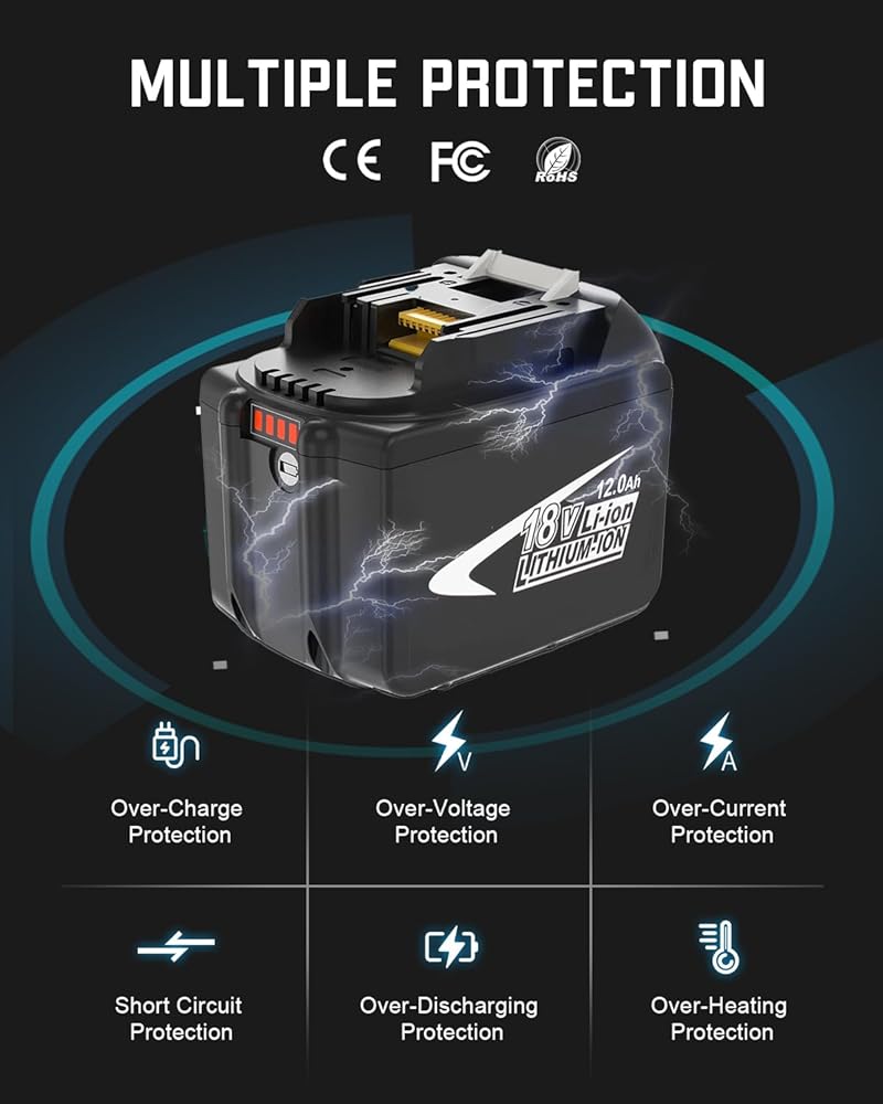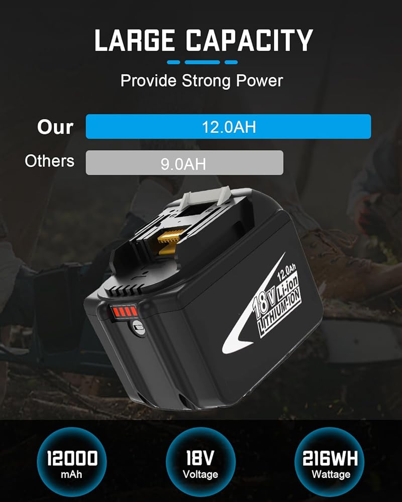 HIGHER CAPACITY : Compared with the 12000mAh battery, the replacement for Makita 18 Volt 12.0Ah battery provides longer running time, make you work more efficiently without charging again and again.