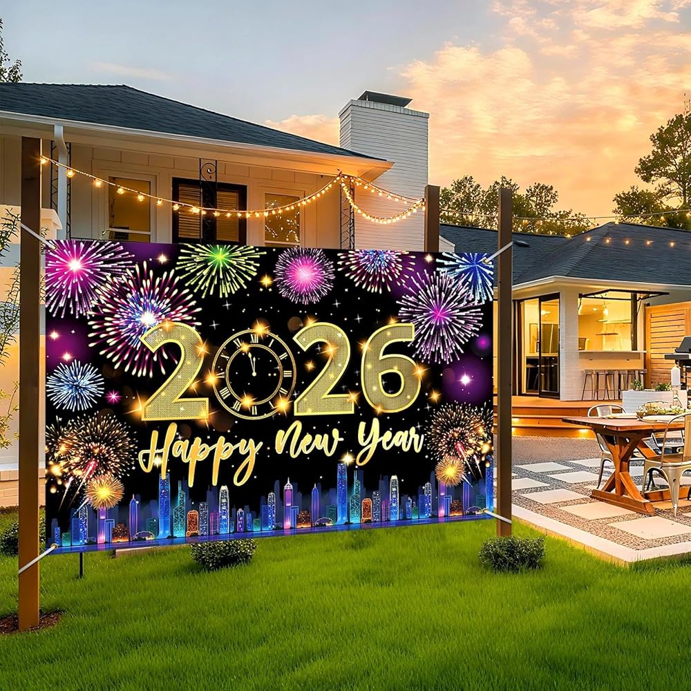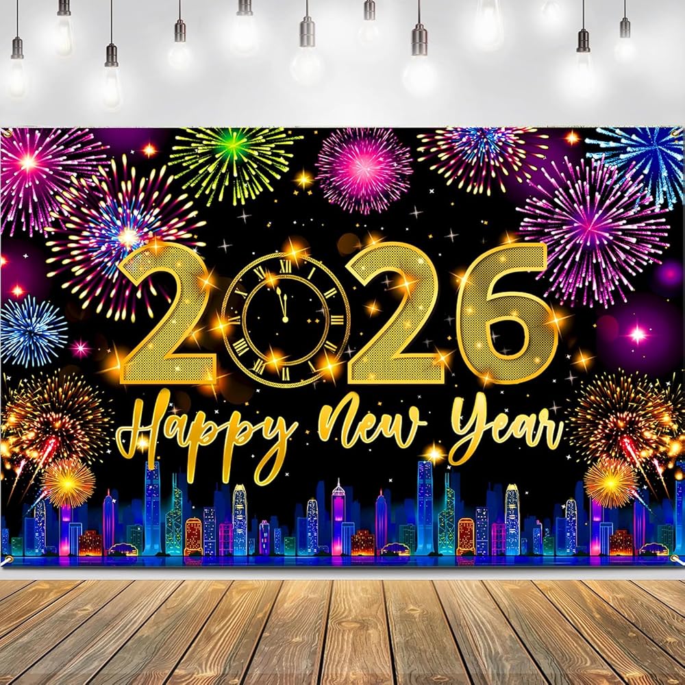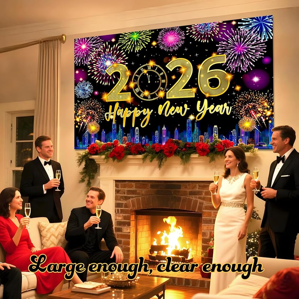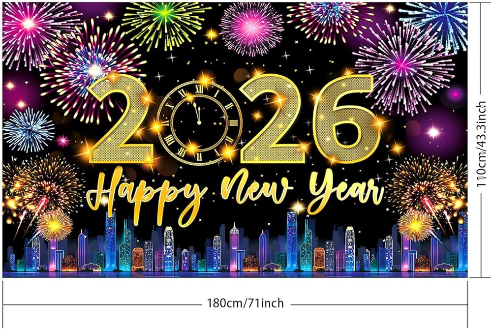 🎉HAPPY NEW YEAR DECORATIONS---This Happy New Year backdrop is printed with elegant golden "Happy New Year" letters and a brightly colored sparkling fireworks glowing in the dark new years eve decorations, with a cityscape printed on it, representing the joyful atmosphere of the New Year and the theme of reunion. It is very suitable as the theme background decoration for a New Year's party.The gold party decorations adds a touch of elegance that will surely impress your guests.