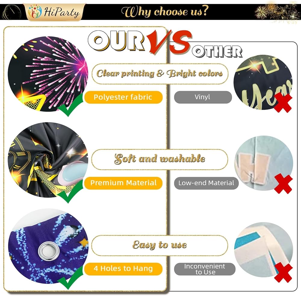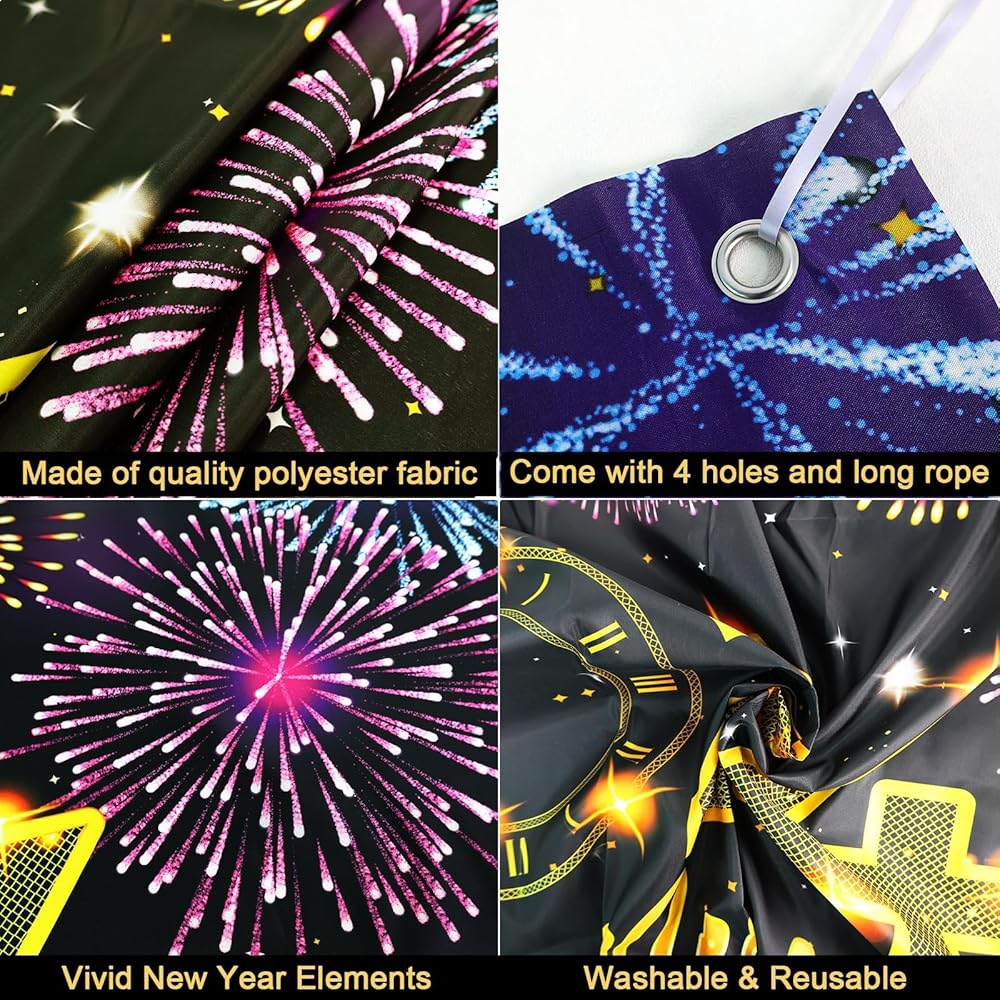 🥳REUSABLE NEW YEAR PARTY FAVORS---This new year background comes with convenient ribbons that make it easy to hang and display. Simply thread the ribbons through the corners of the 180x110cm backdrop and easily hang it.The 2024 New Year's party banner backdrop is made of premium polyester fabric with a smooth surface that is comfortable to touch. It adopts advanced printing technology, ensuring beautiful and vivid New Year patterns. The banner can be reused many times at New Year-themed parties!