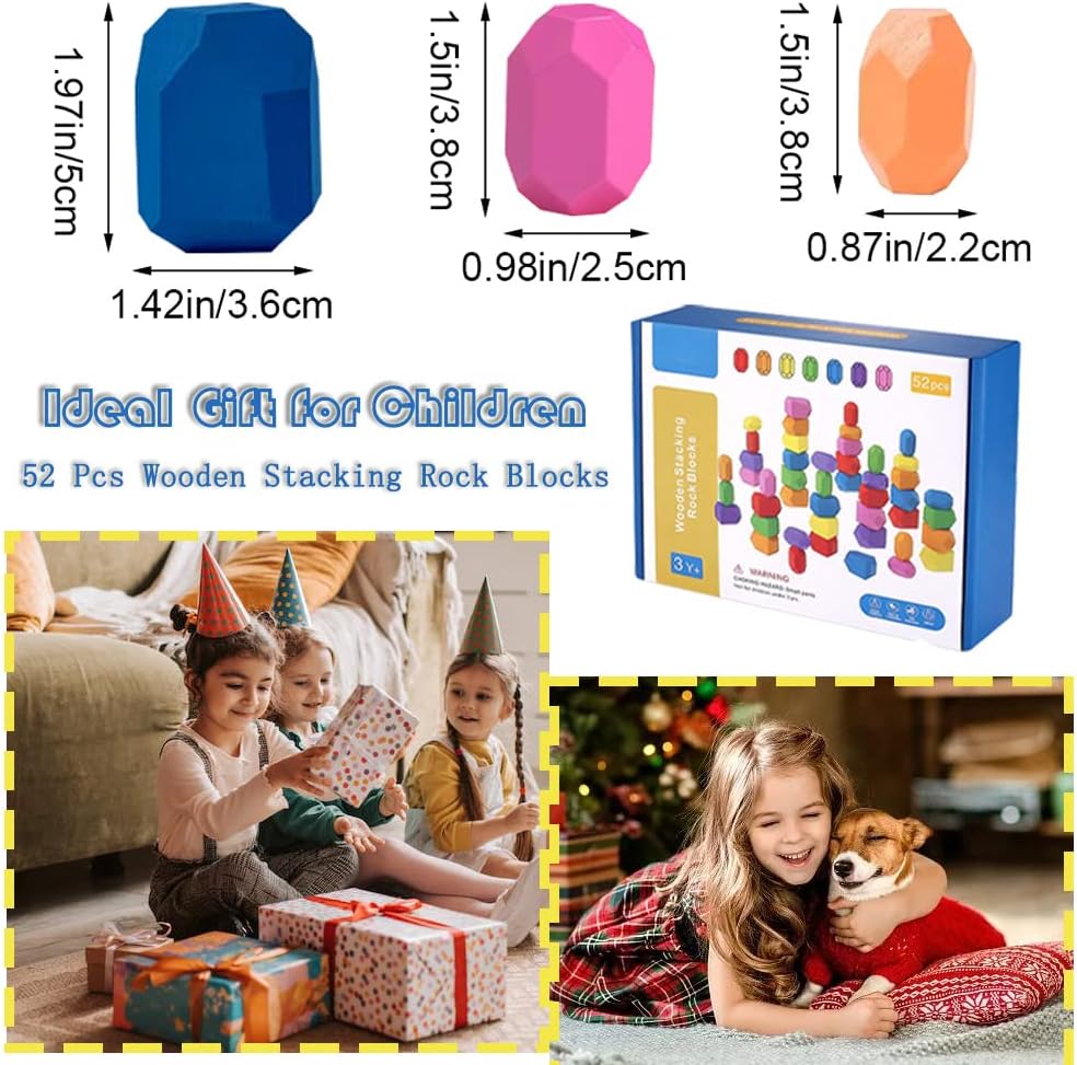 DHinkyoung 52 Pcs Wooden Stacking Rocks Building Stones,Colorful Sorting Blocks Toys for Different Ages Boys & Girls,Preschool Learning Building Blocks Sensory Montessori Toys for Kids Birthday Gifts