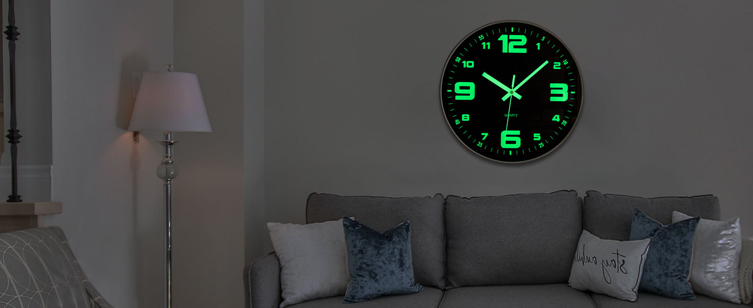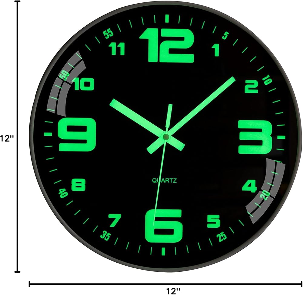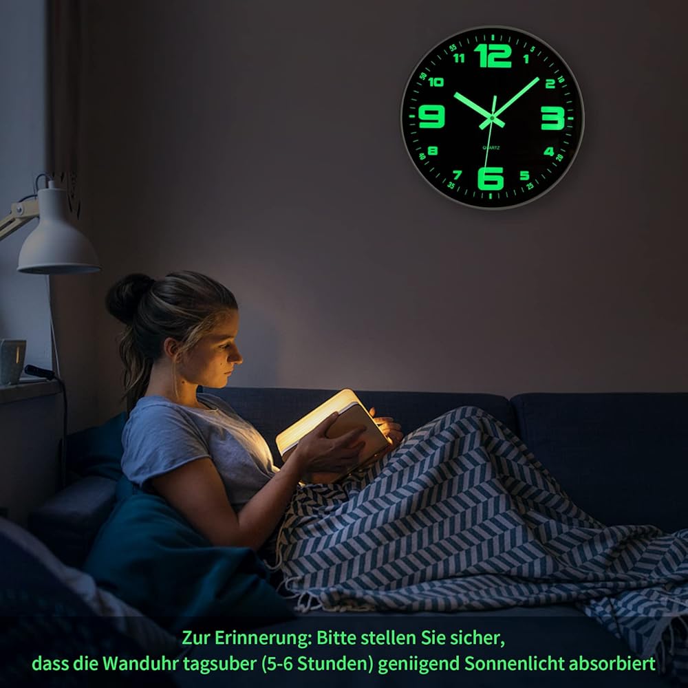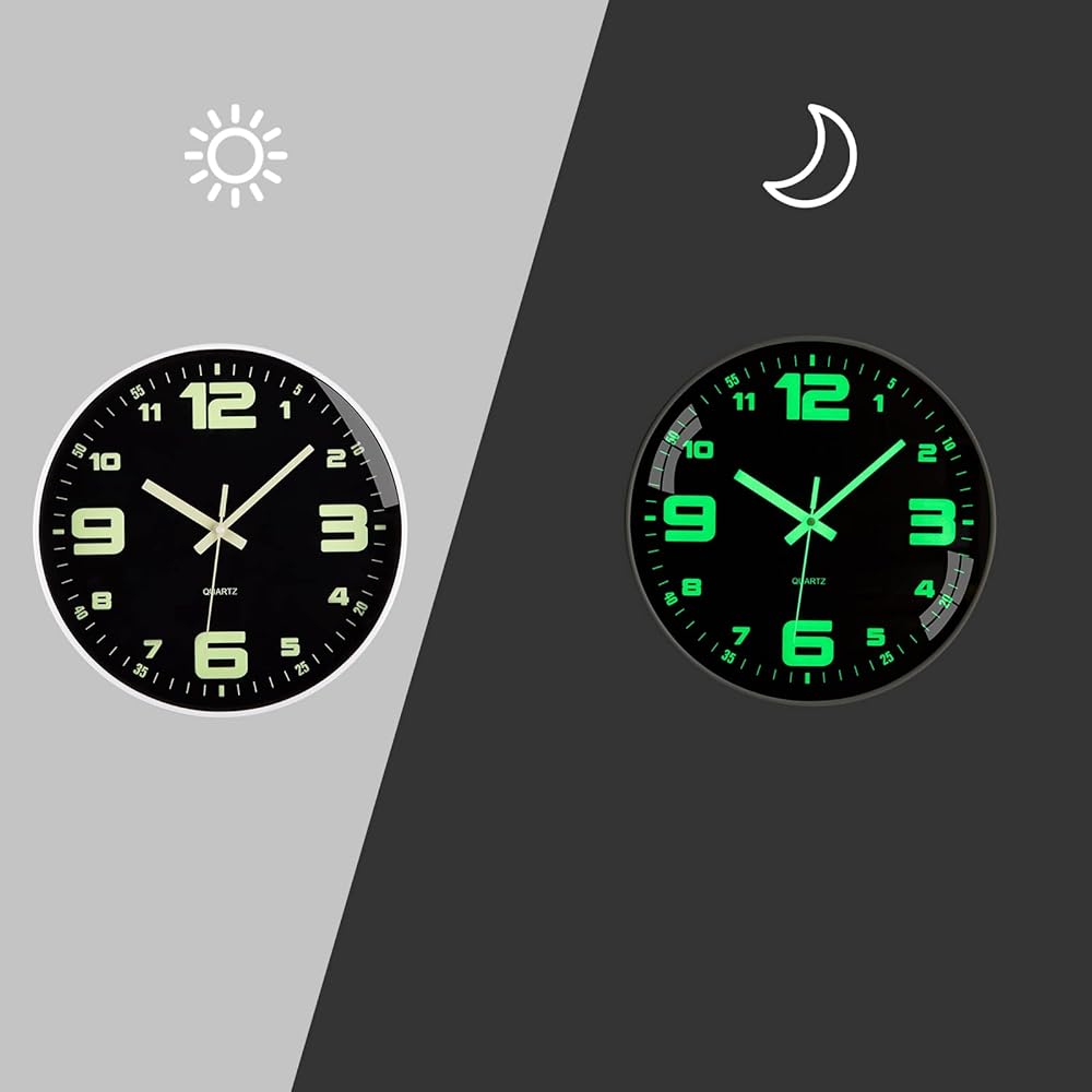 【𝐍𝐈𝐆𝐇𝐓 𝐋𝐈𝐆𝐇𝐓 𝐖𝐀𝐋𝐋 𝐂𝐋𝐎𝐂𝐊】The big clock numbers and hands which have night light function. It asks for absorbing enough light energy during the day. At night, it is released in a fluorescent manner, so you can see the light at night or in the dark.Tips: The product might be run out of energy during a long day in the box, so I advise to let the wall clock absorb light energy (sunshine or fluorescent lamp) more than 4 hour before installation when receive the products.