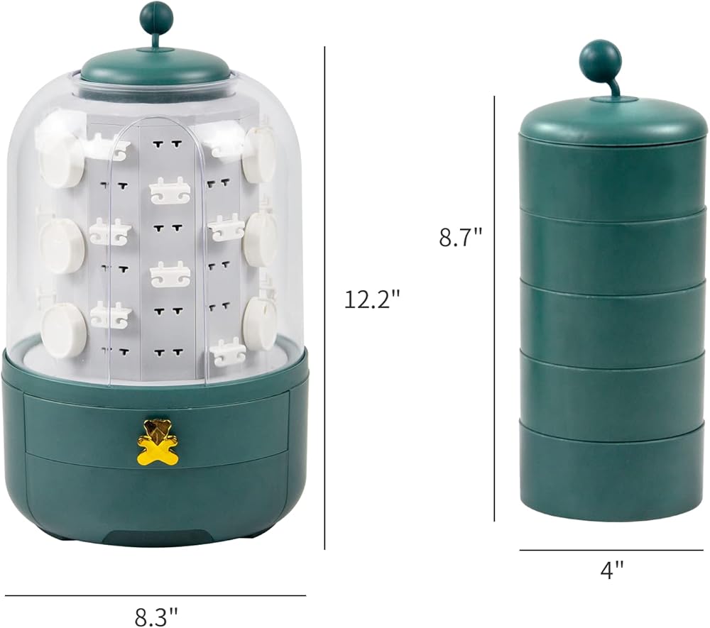 🌈[Space Saving Size]: This jewerly storage organizer measures 8.3"×8.3"×12.2" with 4"×4"×8.7" inner case which occupies less space in any room. It's suitable for the dressing table or countertop in the bathroom, bedroom, or dressing room as earring holder organize & jewelry holder.