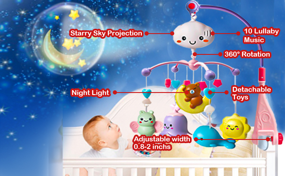 Baby Crib Mobile: This baby mobile contains 10 lullaby musics. With soft music, your baby will fall asleep quickly.