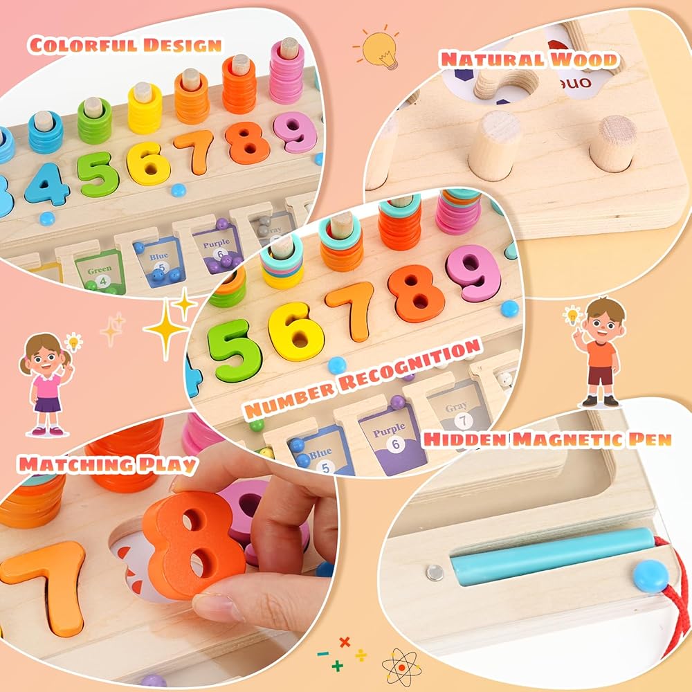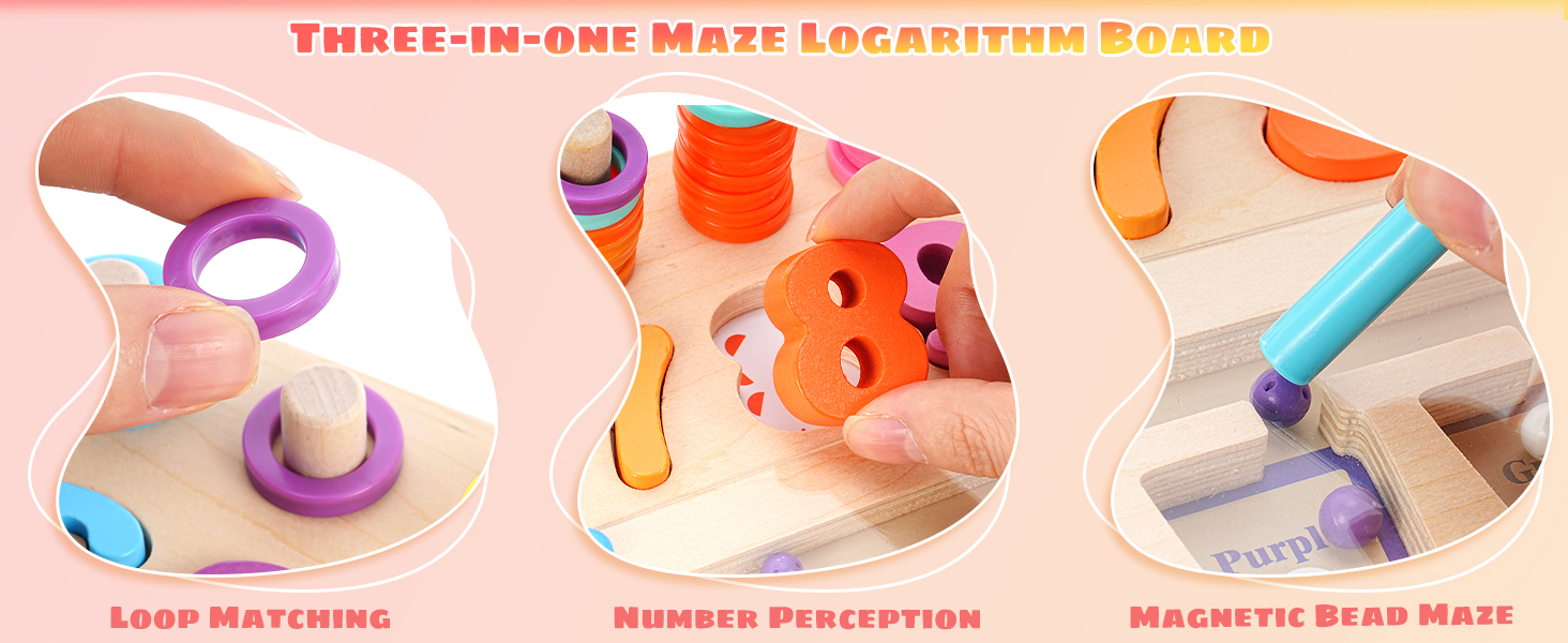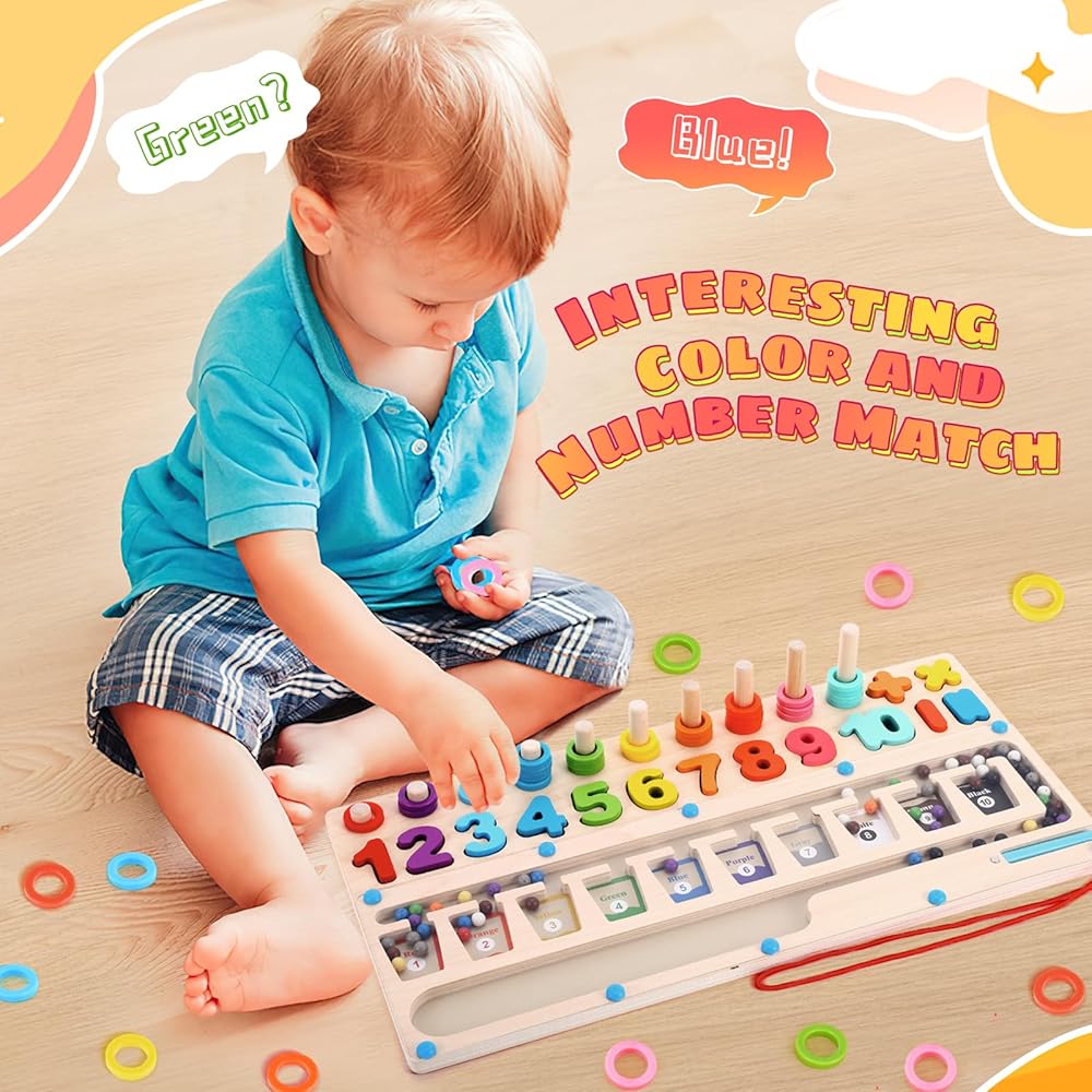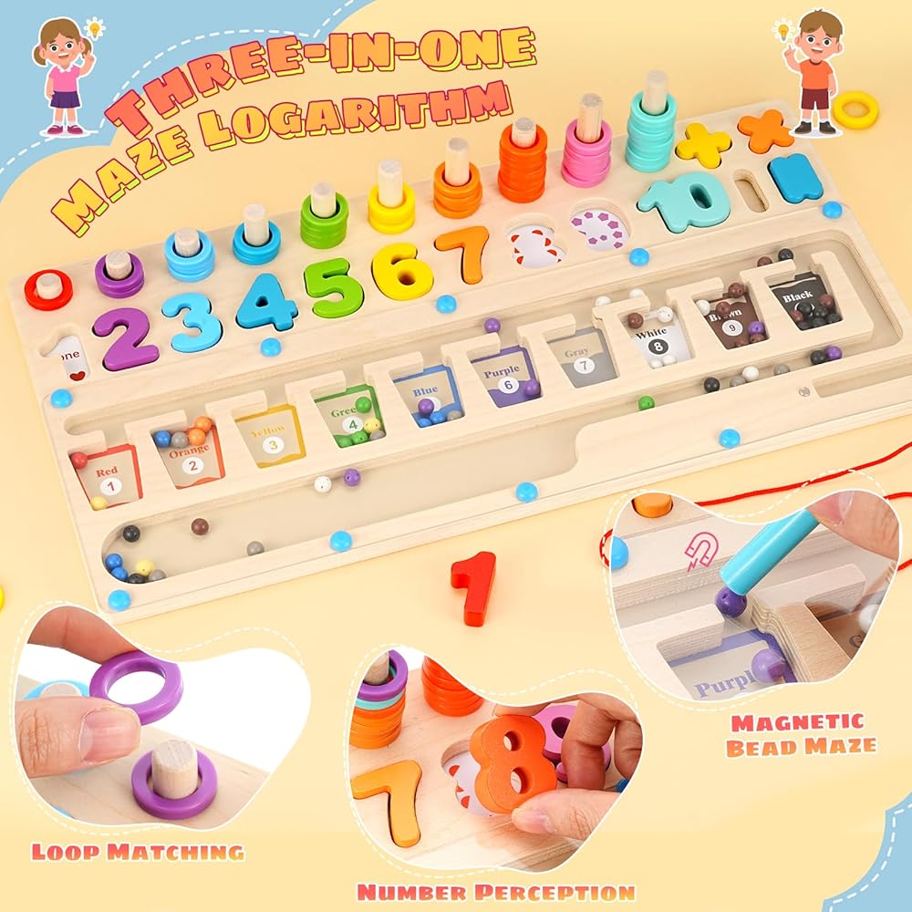 【Interesting Color and Number Maze】Wooden magnetic board puzzle toy contains three games: magnetic sorting bead maze, shape and number matching, and ferrule. Children can play games by matching shapes and colors, and counting blocks. Learn to count and color sort at the same time. Montessori toys can help children develop color and number recognition and counting skills, improve hand-eye coordination and manual dexterity.