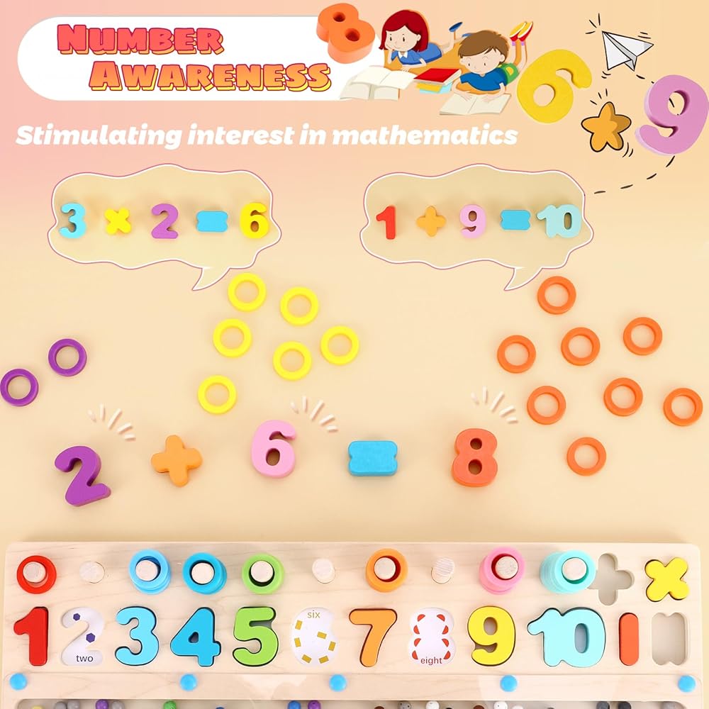 【Early Developmental Toy】We have added classic rings and number matching to the upper part of the toy, helping children build color, quantity and number recognition skills, and practice basic addition, subtraction, multiplication operations. Learning while playing, cultivating children's early mathematical thinking, is a must-have for preschool education, developing important skills in a fun and enjoyable way. This is a great early learning toy.